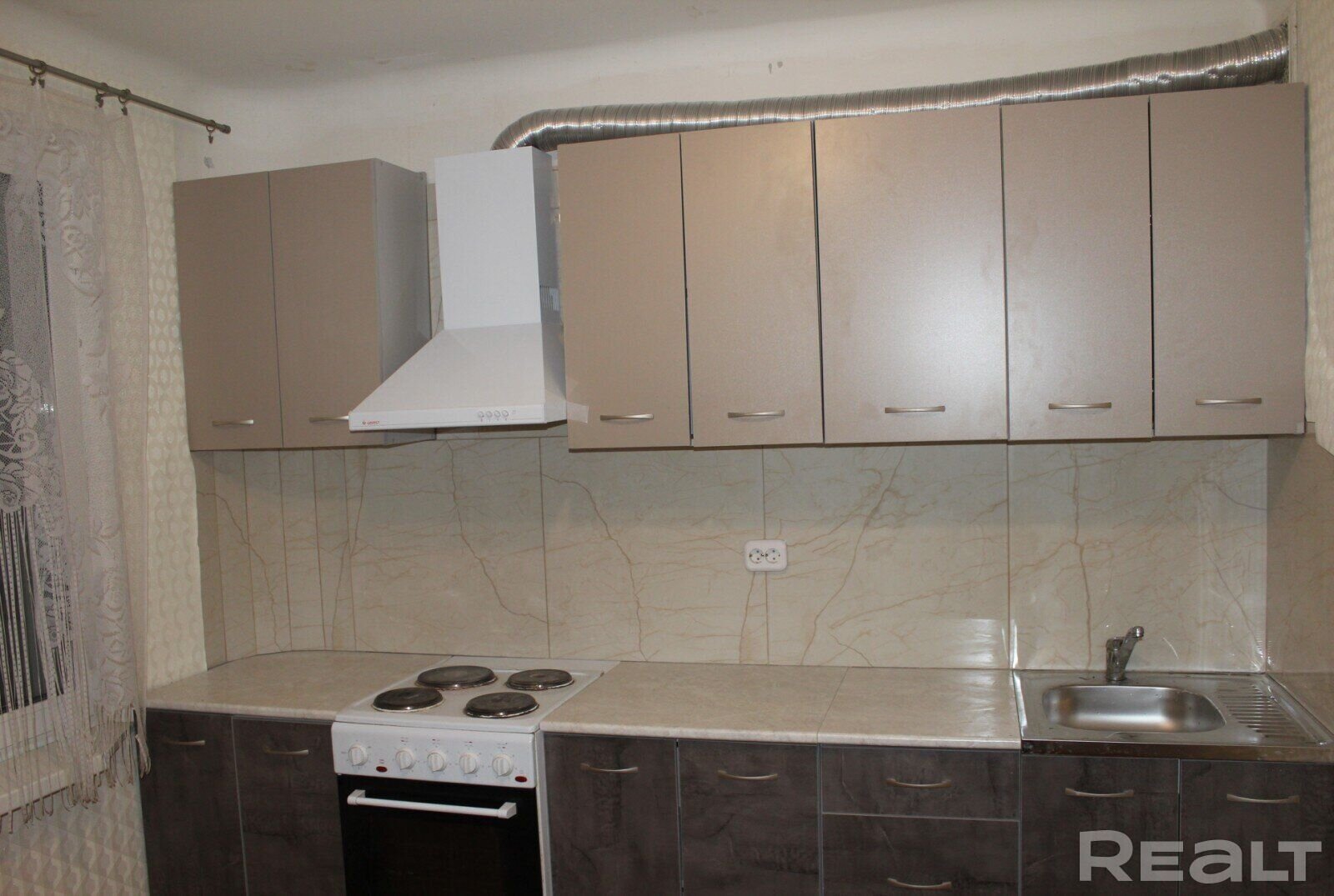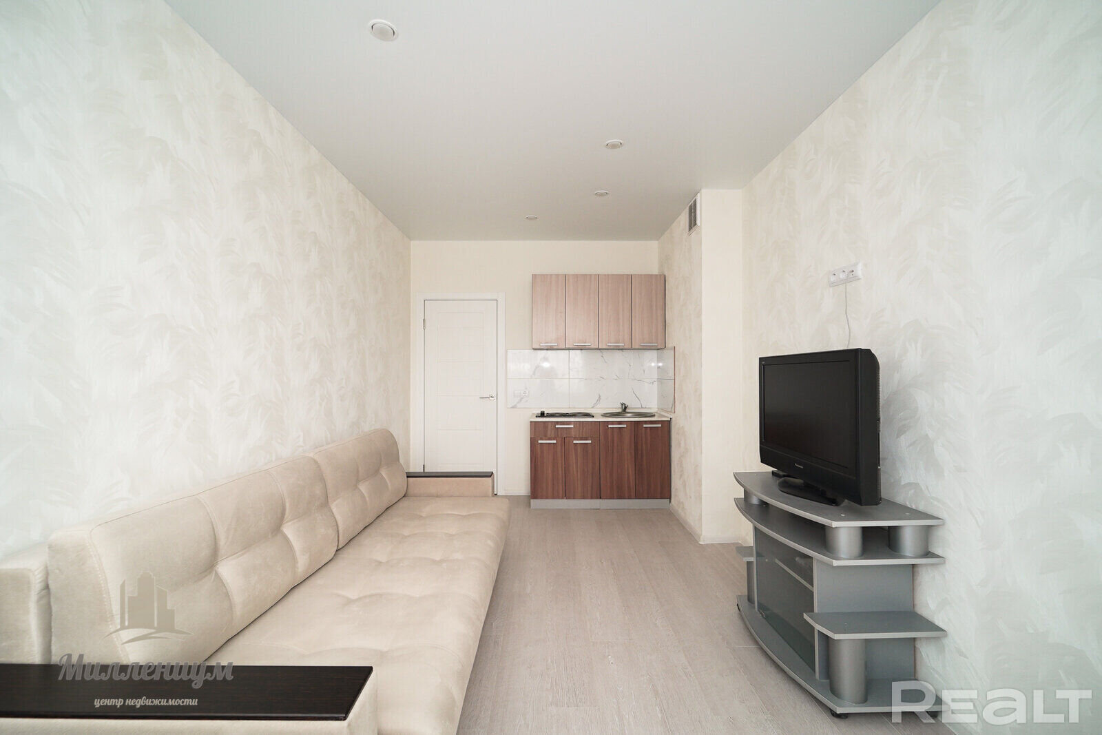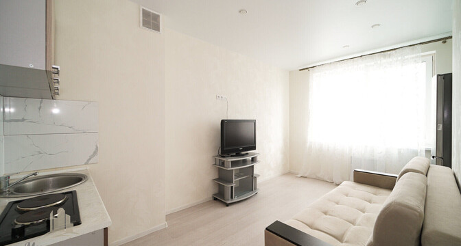 В квартире получилось сделать две изолированные комнаты. Одна из них совместила в себе зоны кухни и гостиной. Кажется, мы нашли самый маленький кухонный гарнитур. Насколько такая планировка удобная, не знаем. Но у покупателей есть возможность переделать все на свой лад или же договориться и получить ключи вместе с мебелью и техникой.