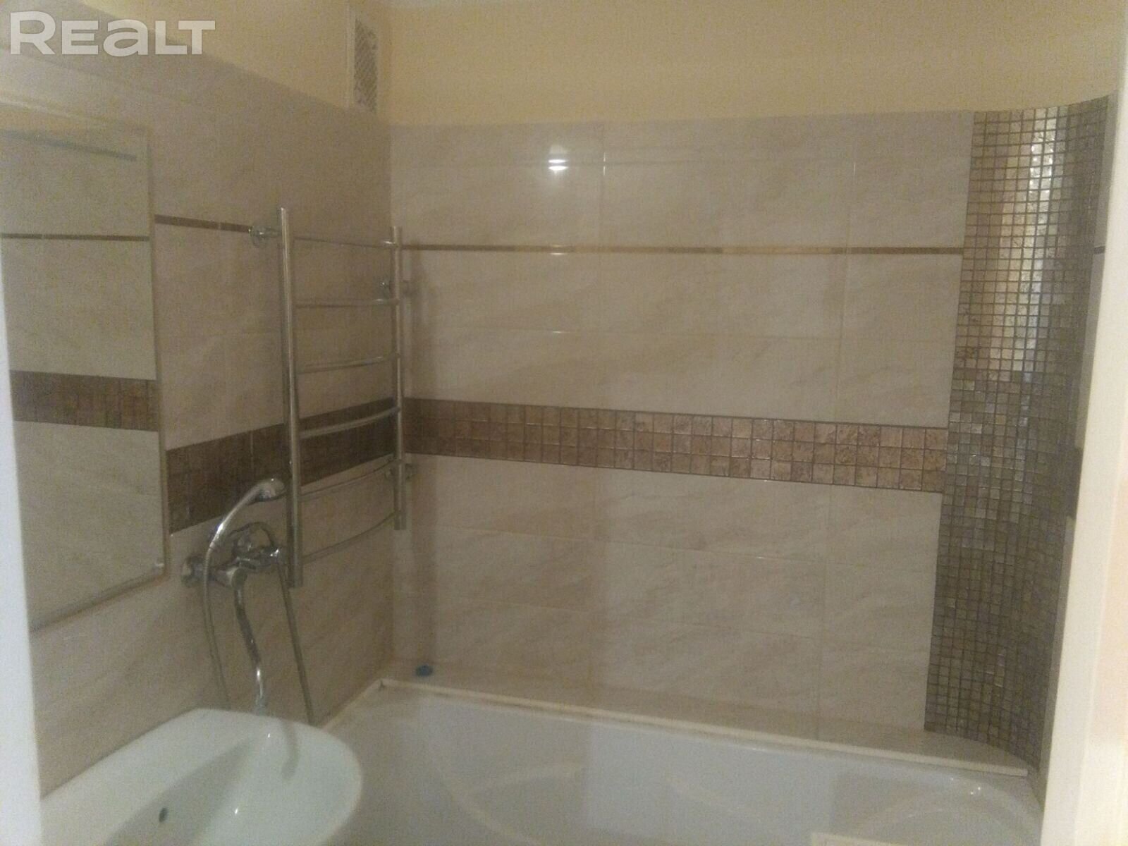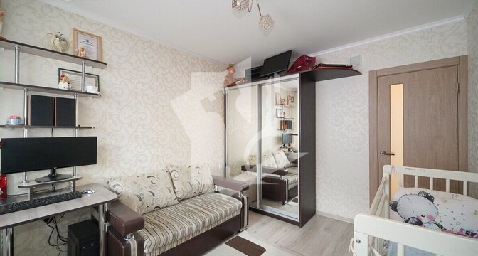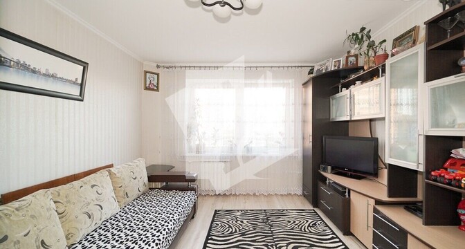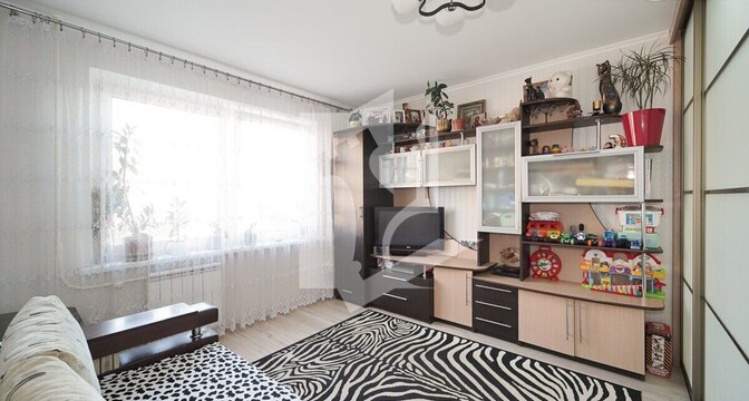 К квартире раздельный санузел с ванной. Владельцы оставляют кухонный гарнитур, вытяжку, встроенные шкафы в прихожей и комнате.