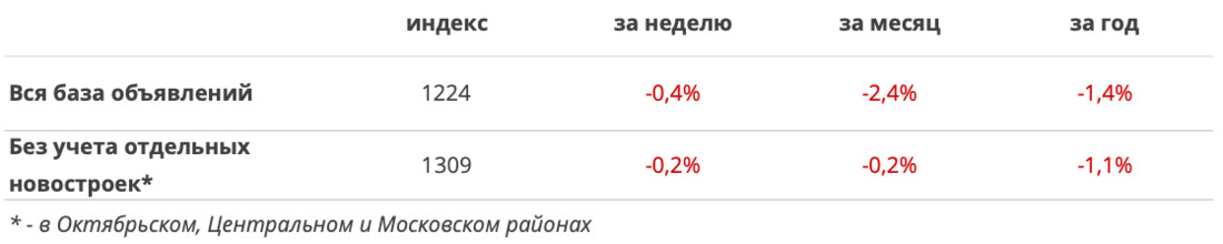Все представленные ниже данные рассчитаны на основе всей базы объявлений (с учетом объявлений о продаже квартир в отдельных новостройках в Октябрьском, Центральном и Московском районах).