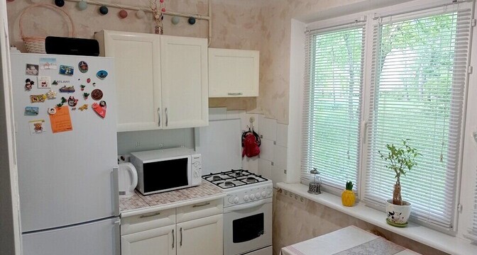 Квартира подготовлена к проживанию. Владельцы сделали хороший ремонт: на полу лежит линолеум, установлены шкафы-купе, есть мебель. Окно в комнате большое, поэтому поступает достаточно много естественного света. Кухонный гарнитур сделан в светлых тонах.