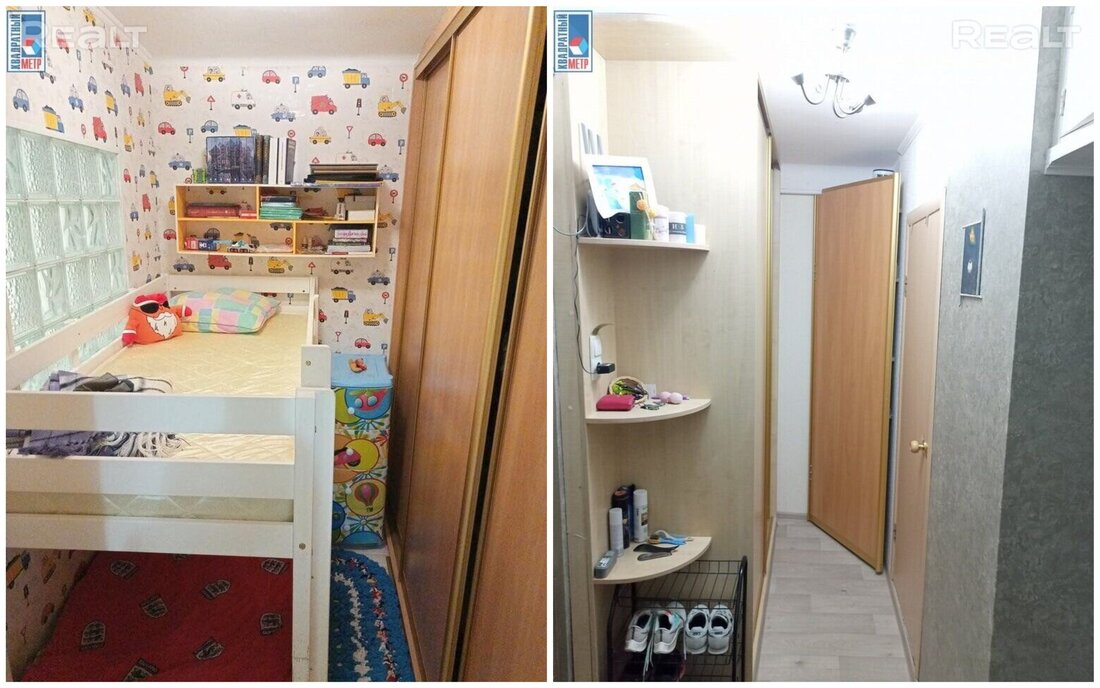В доме был капремонт. Готова к проживанию и квартира. На полу лежит ламинат, установлены шкафы-купе. Комнату владельцы разделили на две зоны с помощью стеклоблоков. В маленьком уголке стоит детская кровать.