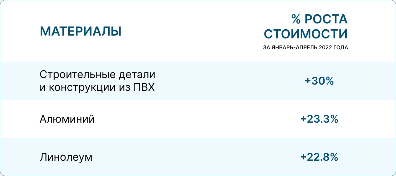 Рост стоимости м2 ожидается уже этой осенью, когда завершится сезон отпусков. За январь-апрель 2022 года строительные материалы подорожали на 14,4%! При этом стоимость определенных товаров из этой категории выросла еще заметнее.