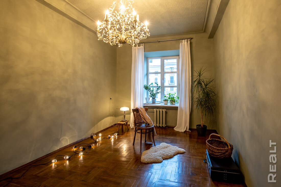 Четырехкомнатная сталинка находится на проспекте Независимости, 19. Больше полугода там располагалась фотостудия и офис дизайнера Вероники Багринцевой. Воплотить давние мечты ей разрешила у себя в квартире свекровь. Вероника вместе со своей коллегой чуть освежили комнаты и приукрасили вещами: роскошной люстрой, советскими лампами и добавили минималистичную мебель. Девушки старались сохранить домашний уют и передать дух сталинки.
