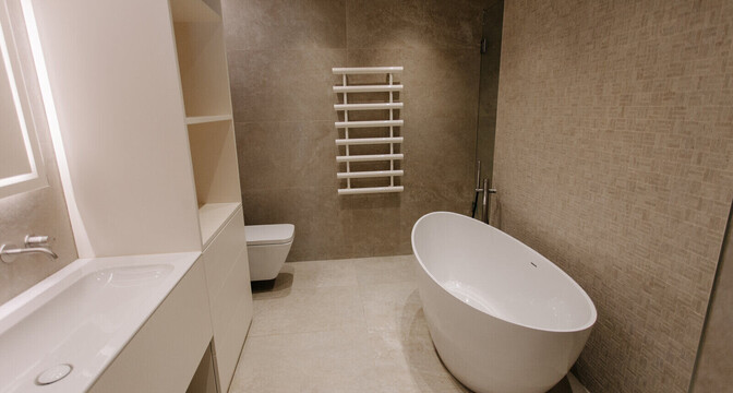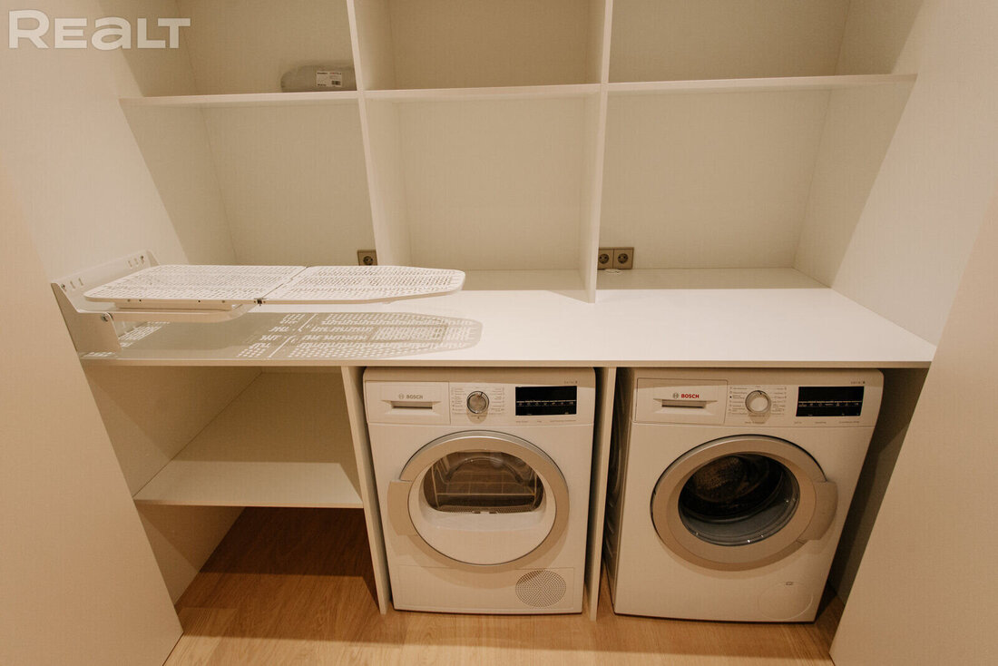 Санузлы разделяет стенкой: один в спальне, другой — общий. Во втором владельцы организовали и постирочную.
