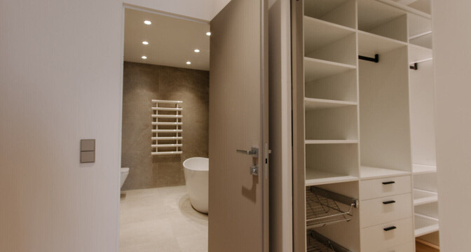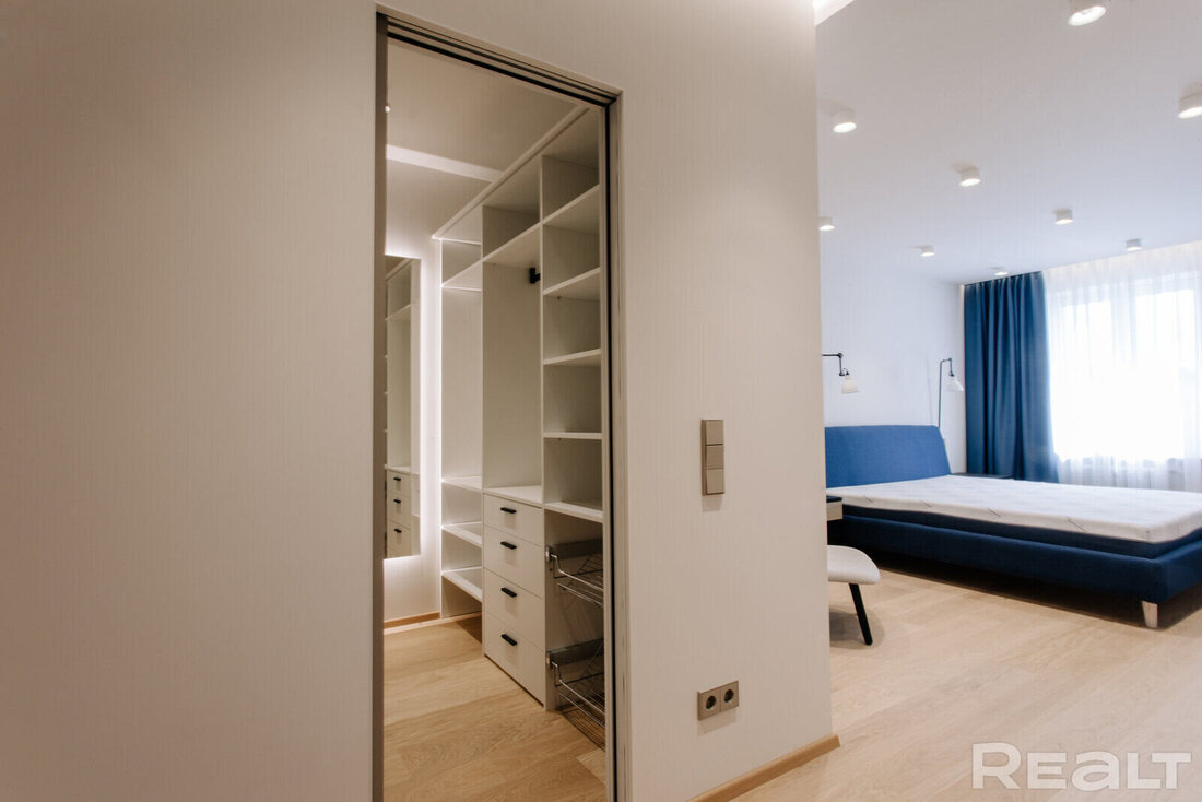 К одной из спален, санузлу и гардеробной ведет одна дверь Три помещения примыкают друг другу, отделяясь от остального пространства.