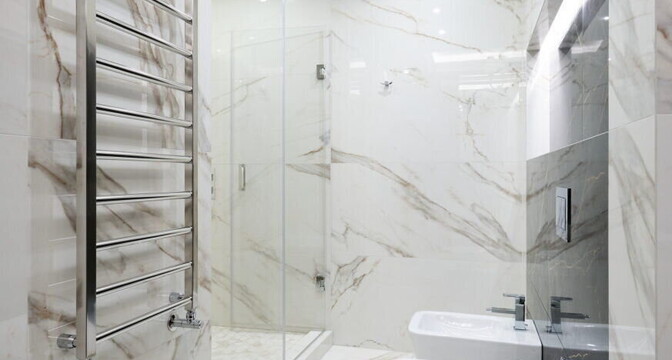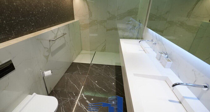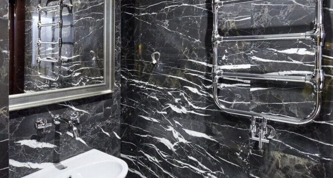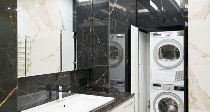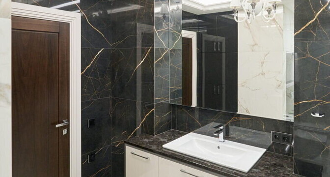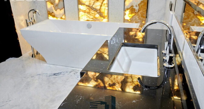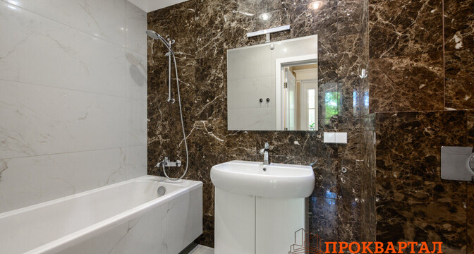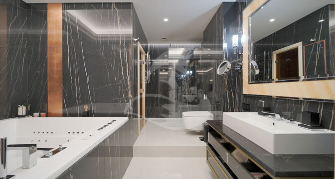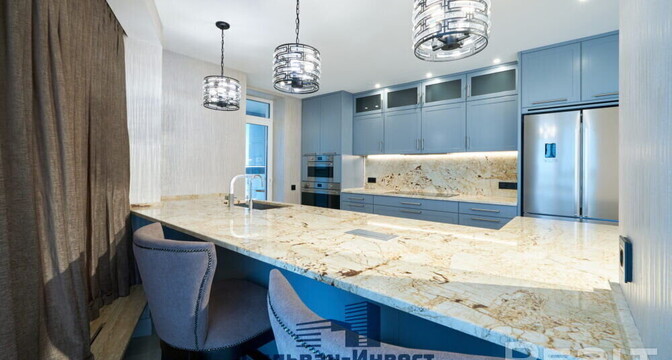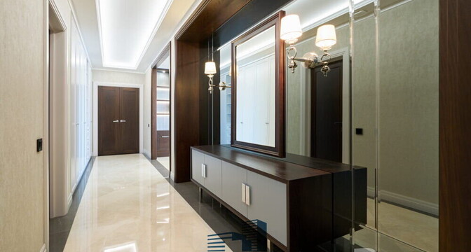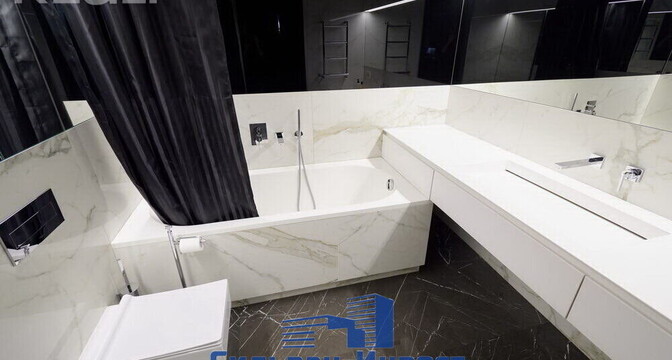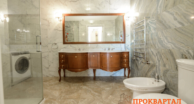 В квартире сделан дизайнерский ремонт с отделкой из натурального мрамора, оникса и паркетом на полу.
