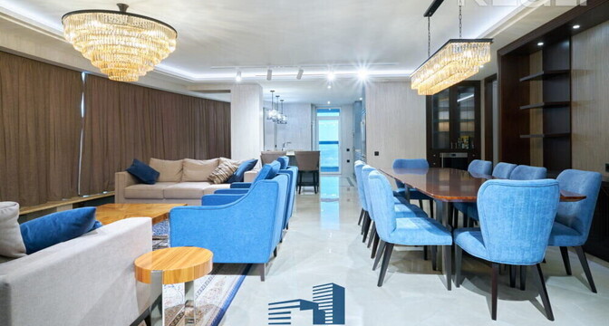 Над интерьером квартиры работал дизайнер. Она продается со всей мебелью и техникой, что представлена на фото. В отделке использовались только итальянские материалы. Мебель и предметы интерьера коллекционные. Здесь есть два санузла и две лоджии. На полу лежит натуральный мрамор. Из него сделан и стол, отделаны стены. В квартире есть просторная гардеробная комната и несколько шкафов.
