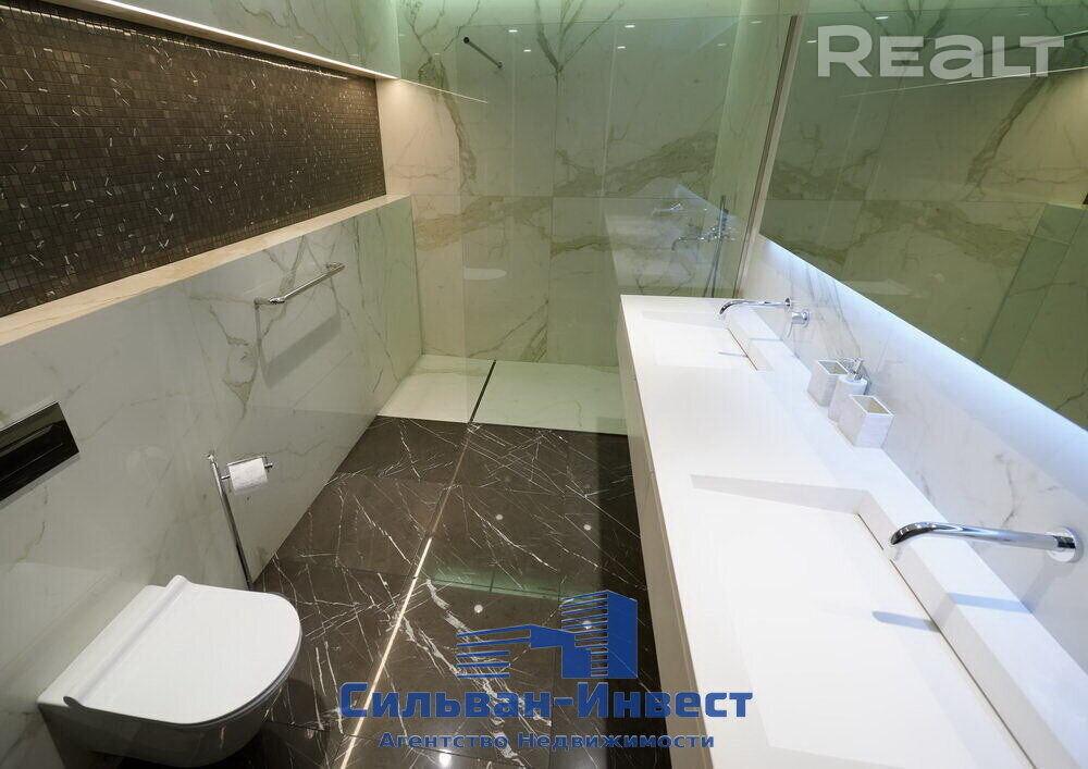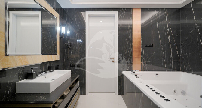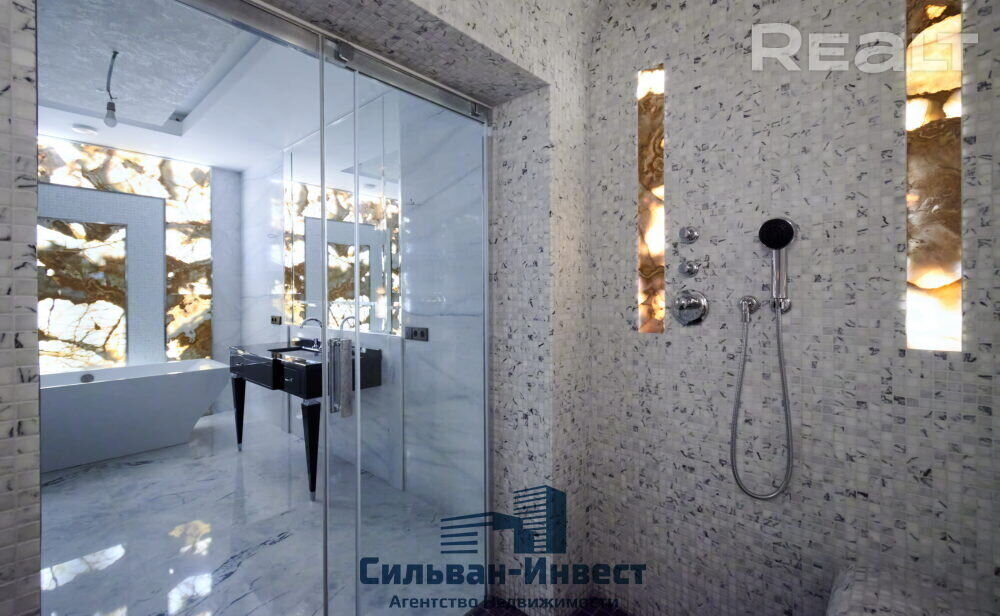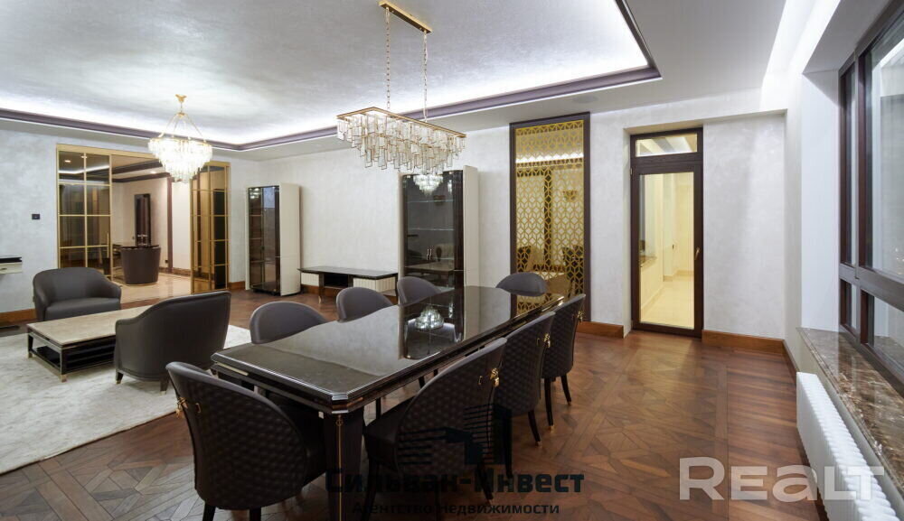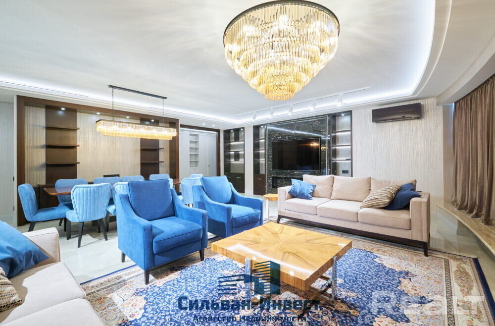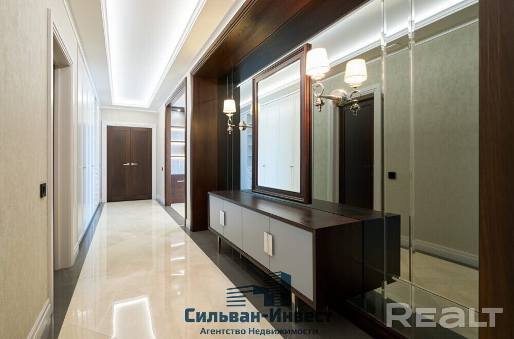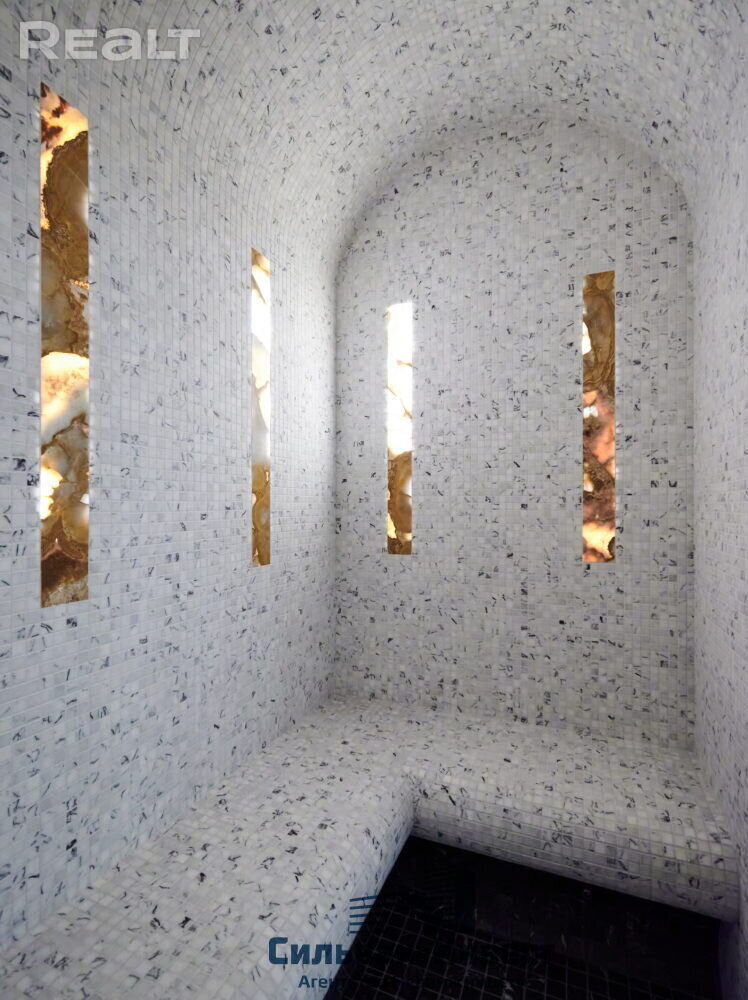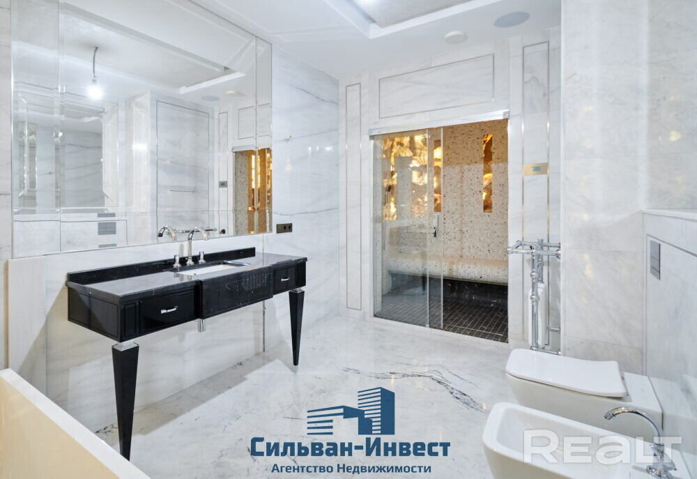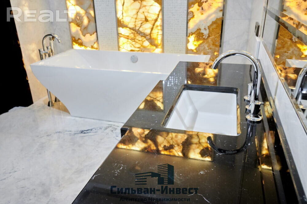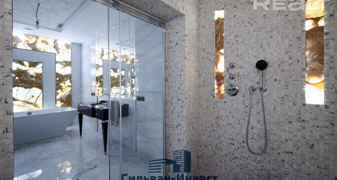 В четырехкомнатной квартире есть 4 санузла и две застекленные лоджии. Здесь встроена система «Умный дом». Внутри сделан дизайнерский ремонт. На полу лежат щитовой паркет и натуральный мрамор. Он же присутствует на стенах санузлов, подоконниках и столе. Декоративное панно сделано из оникса, а зеркальные панно выполнены на заказ. Сантехника брендов Villeroy& Boch, Huppe, Steinberg, Devon Devon. Изюминкой одного из санузлов авторы объявления называют роскошный хамам со звездным небом.