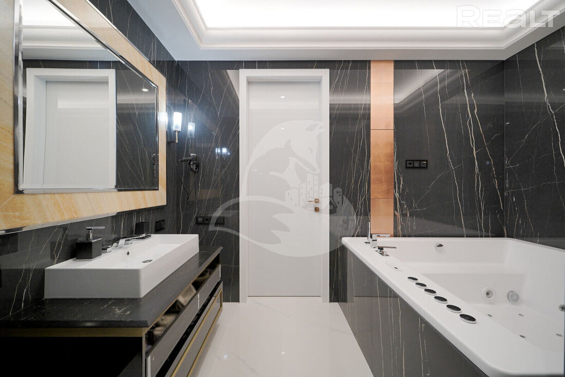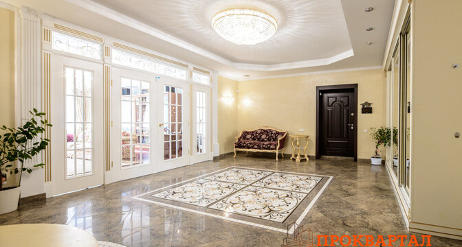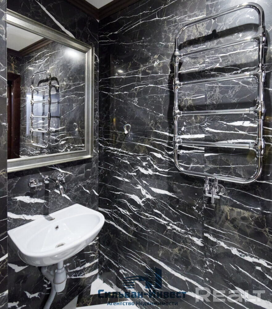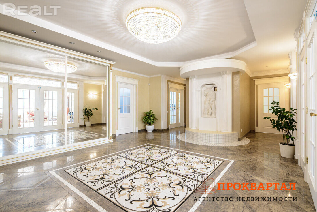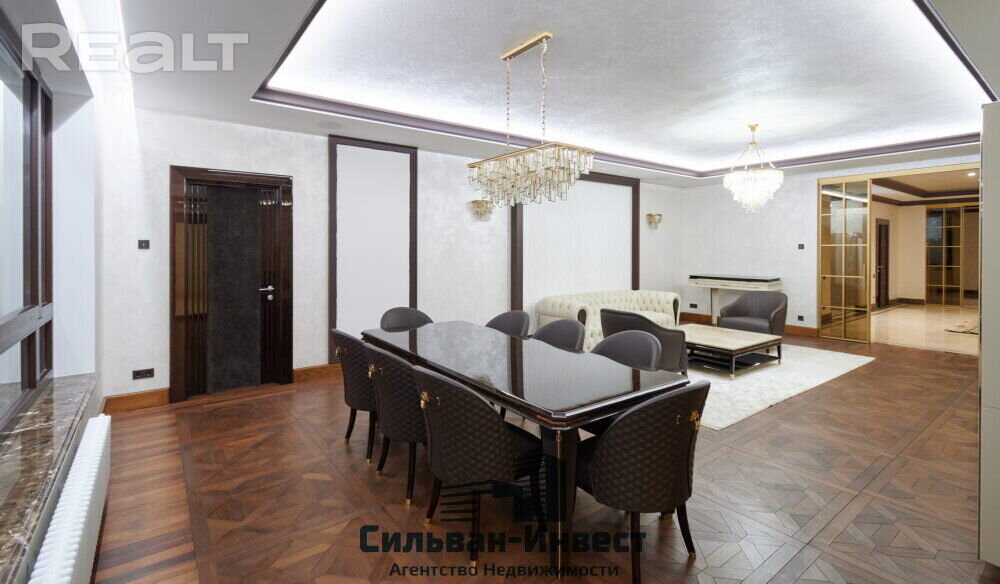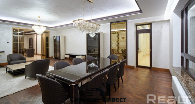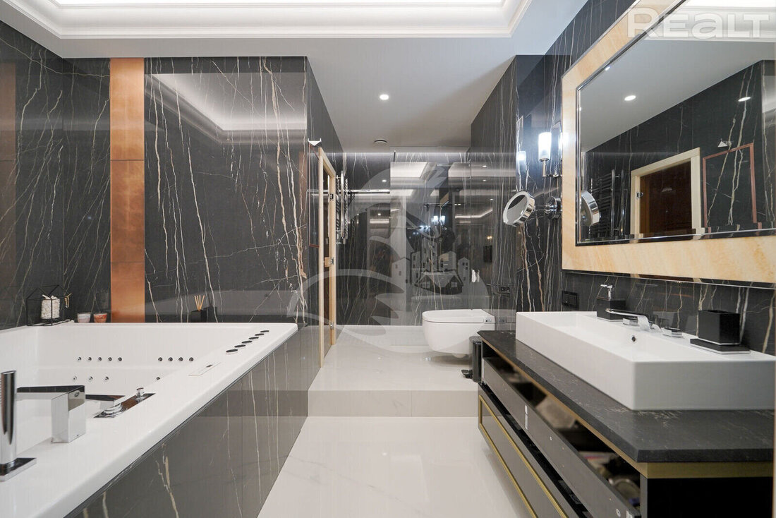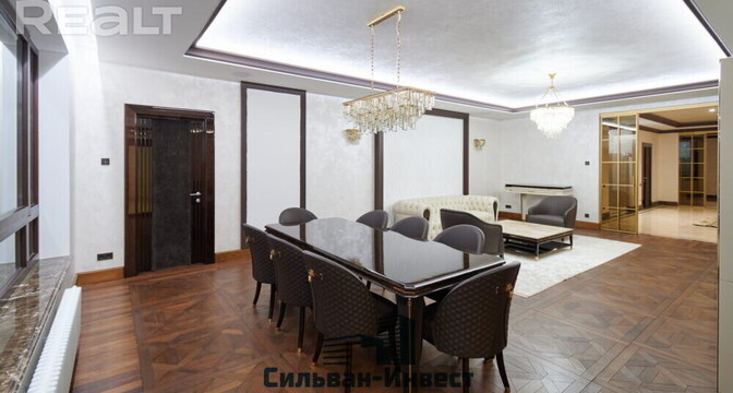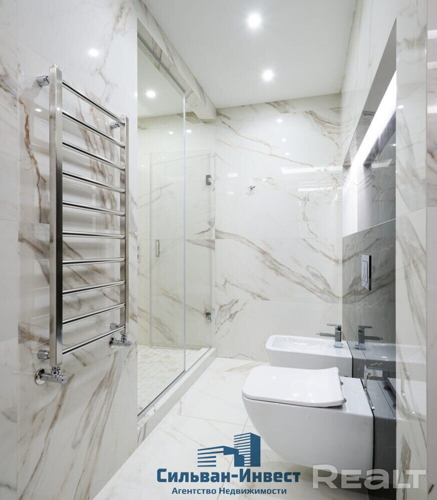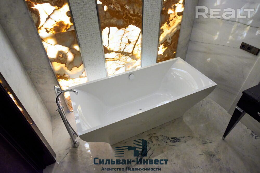 В четырехкомнатной квартире есть 4 санузла и две застекленные лоджии. Здесь встроена система «Умный дом». Внутри сделан дизайнерский ремонт. На полу лежат щитовой паркет и натуральный мрамор. Он же присутствует на стенах санузлов, подоконниках и столе. Декоративное панно сделано из оникса, а зеркальные панно выполнены на заказ. Сантехника брендов Villeroy& Boch, Huppe, Steinberg, Devon Devon. Изюминкой одного из санузлов авторы объявления называют роскошный хамам со звездным небом.