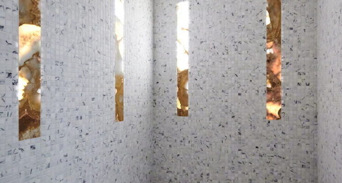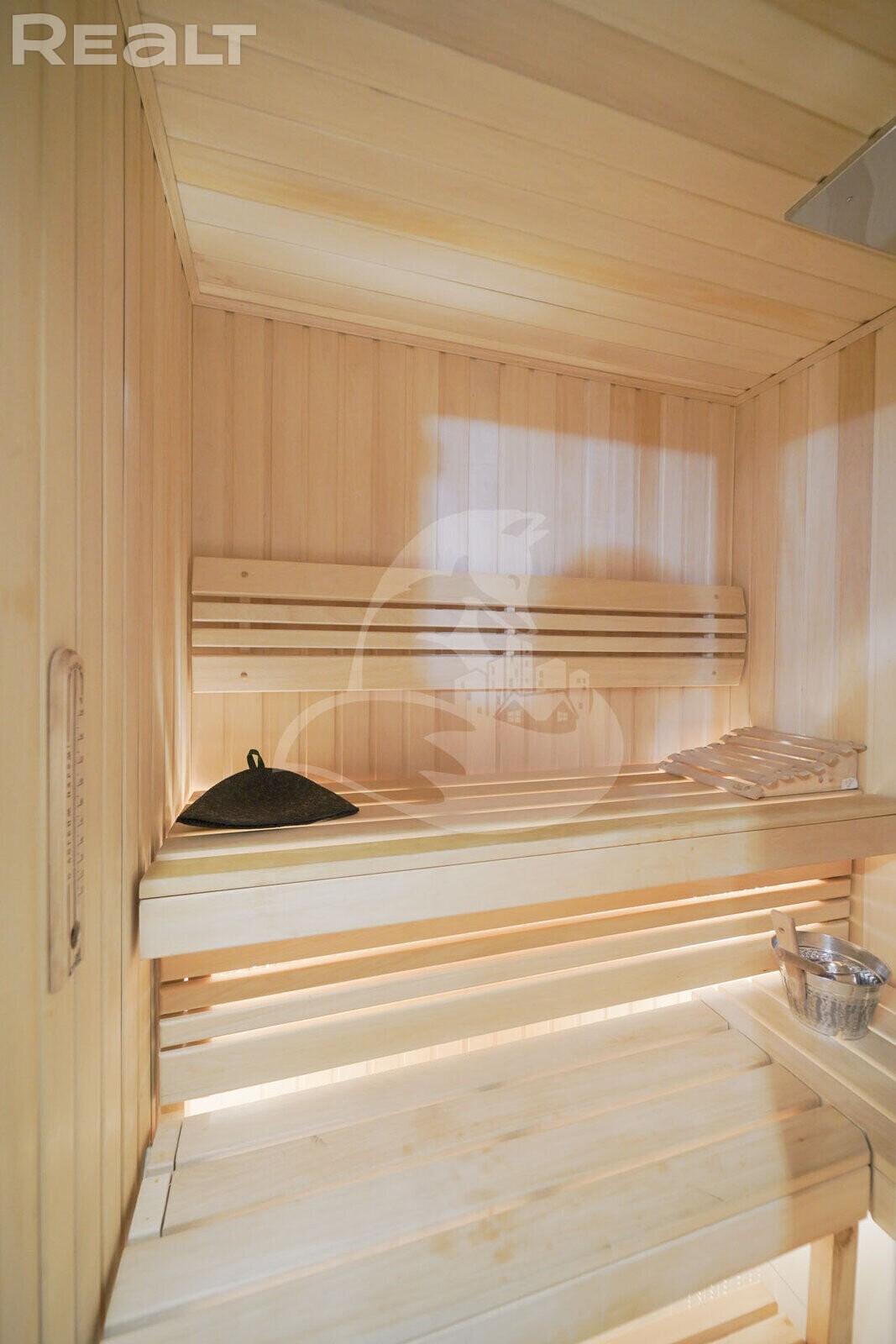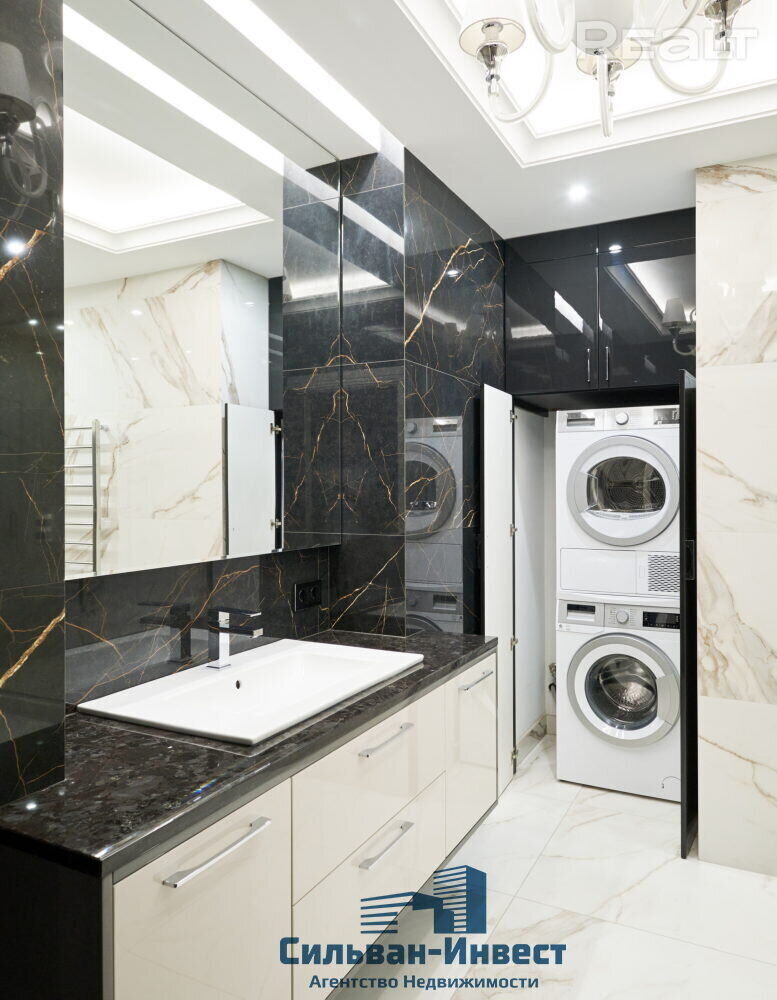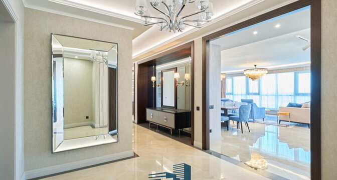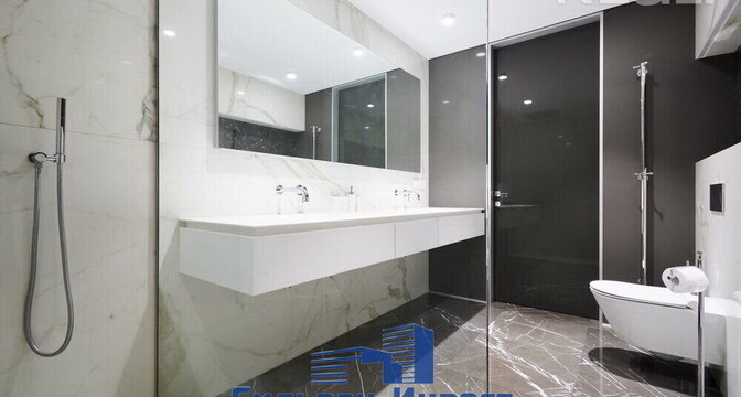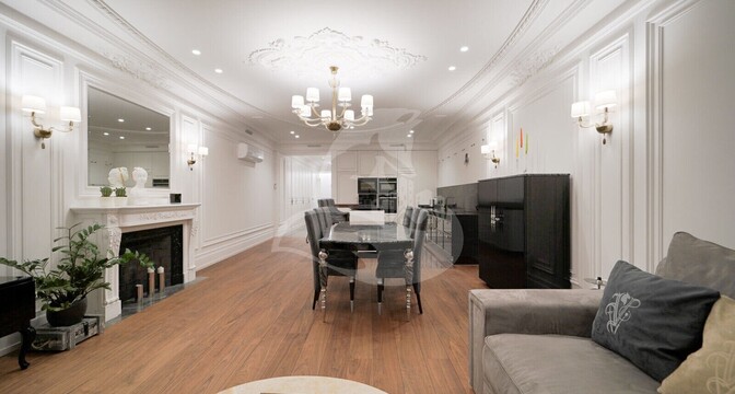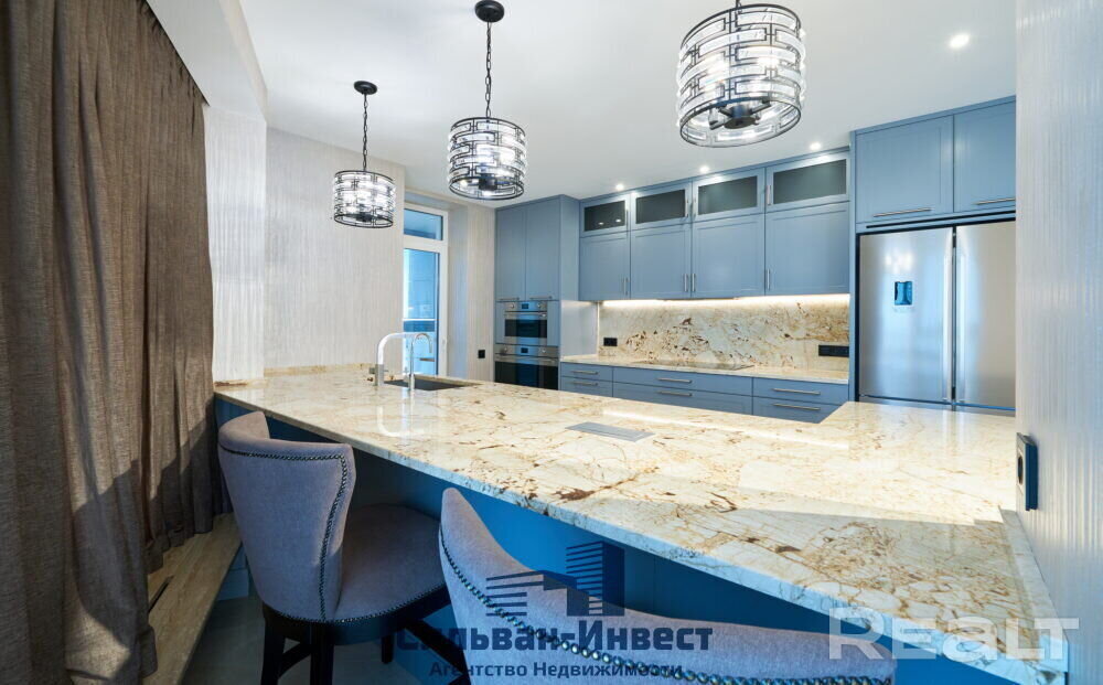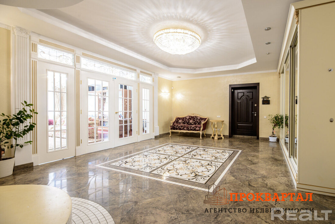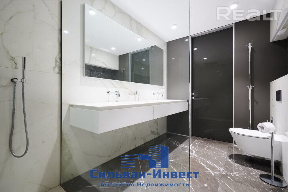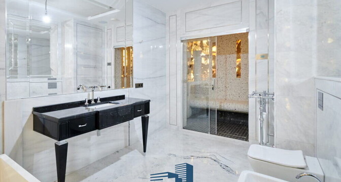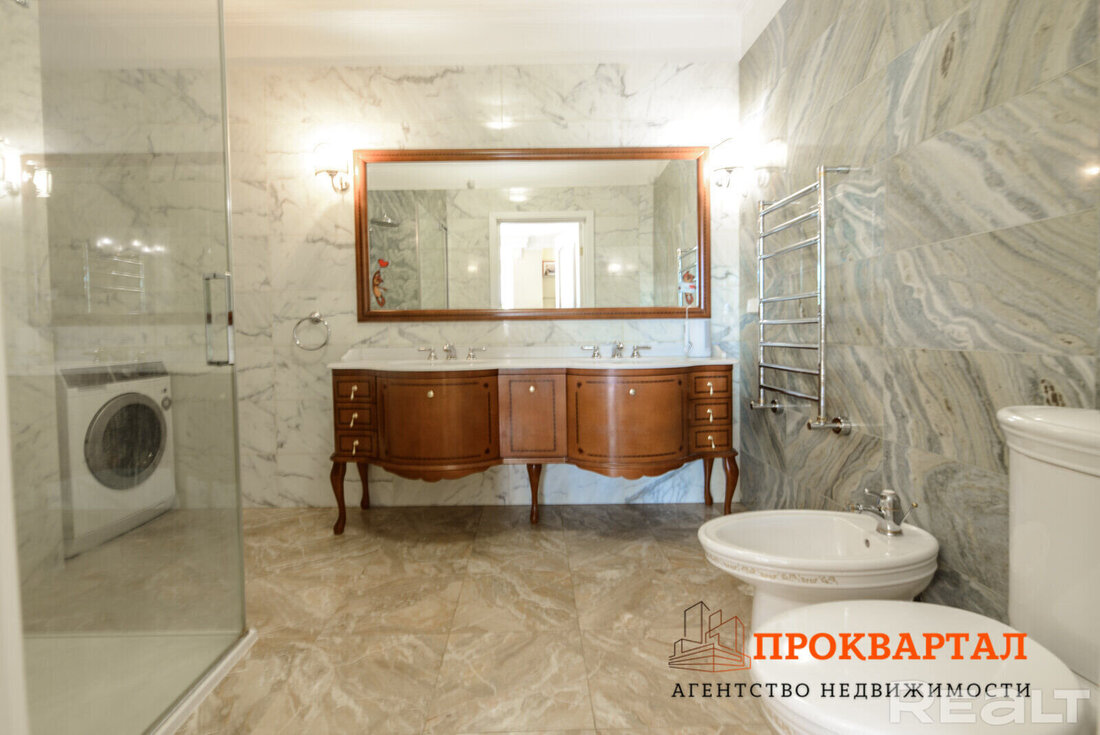 В четырехкомнатной квартире есть 4 санузла и две застекленные лоджии. Здесь встроена система «Умный дом». Внутри сделан дизайнерский ремонт. На полу лежат щитовой паркет и натуральный мрамор. Он же присутствует на стенах санузлов, подоконниках и столе. Декоративное панно сделано из оникса, а зеркальные панно выполнены на заказ. Сантехника брендов Villeroy& Boch, Huppe, Steinberg, Devon Devon. Изюминкой одного из санузлов авторы объявления называют роскошный хамам со звездным небом.