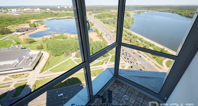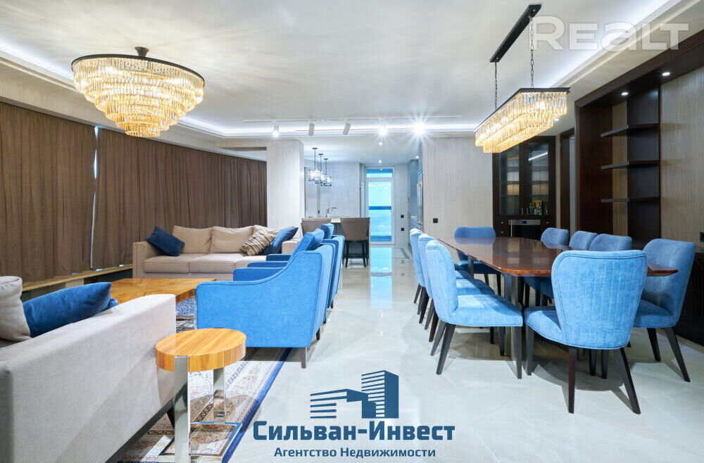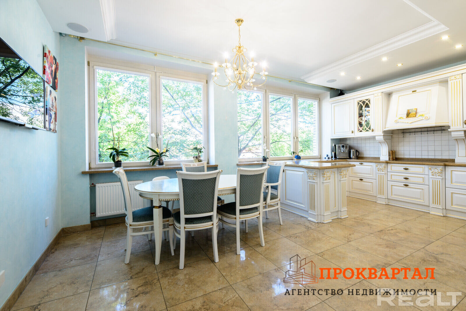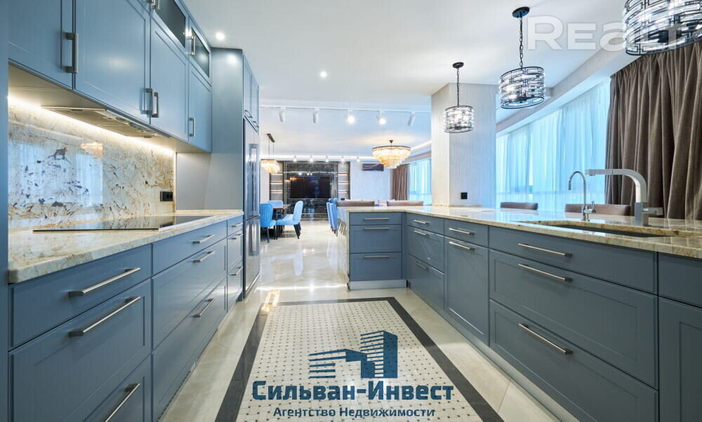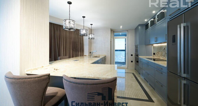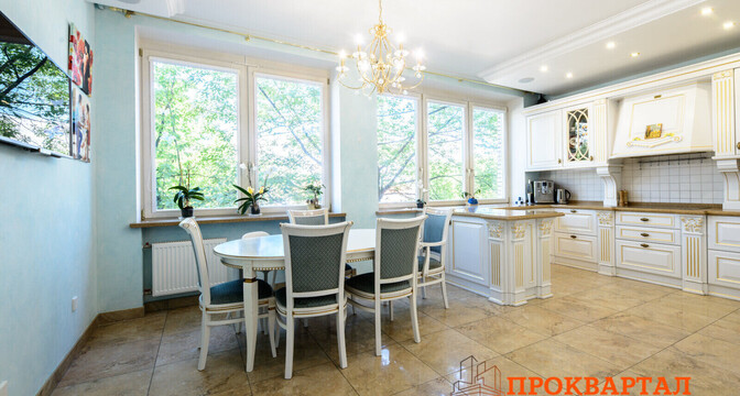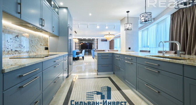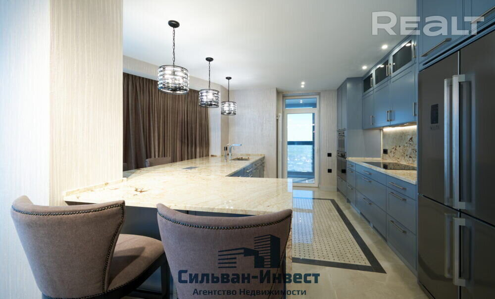 Квартира располагается на последнем 26 этаже жилого комплекса D3 на проспекте Победителей, 135/Б. Общая площадь 6-комнатной квартиры — 270,2 «квадрата». Кухня — 81, 7 м².