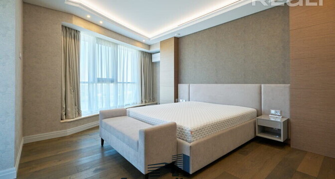 В квартире всего по два: спальни, санузла и балкона. Тут выполнен современный дизайнерский ремонт. На полу лежит мрамор итальянского производства. Стены отделаны декоративной штукатуркой Caparol и плиткой FMG. Мебель в квартире брендов B&B Italia, Bonaldo, Cassina, Senso. Кухня — Cesar и Senso (РБ). Встроенная техника — Liebherr и Siemens. Сантехника установлена компании Villeroy&Boch, Custom.