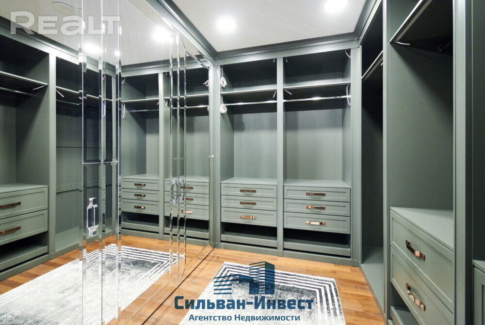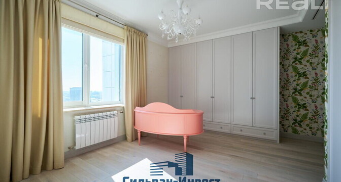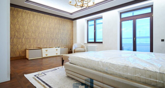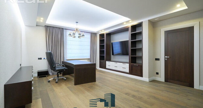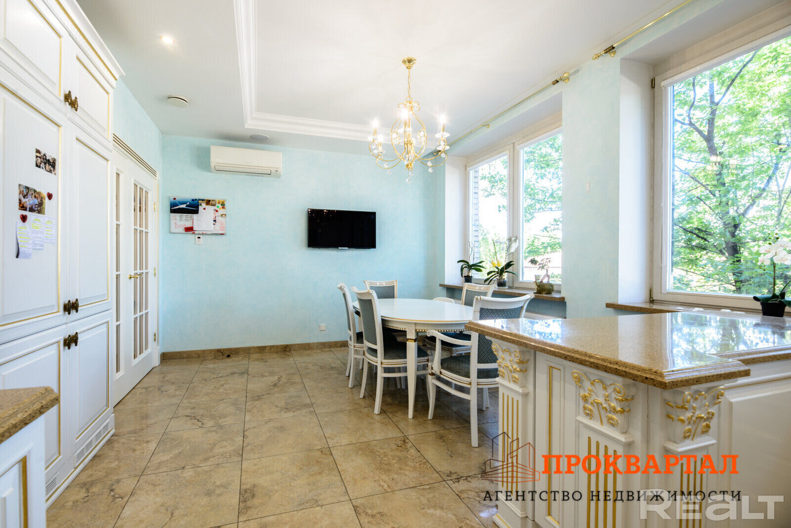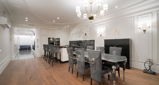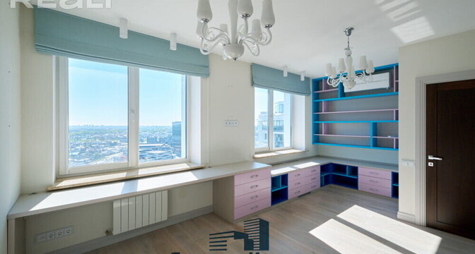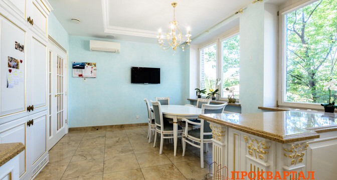 Квартира состоит из шести жилых комнат, трех санузлов с душем и ванной, гардеробной, хозяйственной комнатой, двух застекленных балконов. Тут сделан дизайнерский ремонт. На полу в комнатах лежит дубовый паркет, плитка - в гостиной и санузлах. Встроенную и мягкую мебель делали под заказ. Помимо мебели, в квартире остается и техника: кондиционеры Mitsubishi Electric, бытовая техника Smeg: холодильный, духовой шкаф, микроволновка, плита, посудомоечная машина, винный шкаф, стиральная машина и сушка.