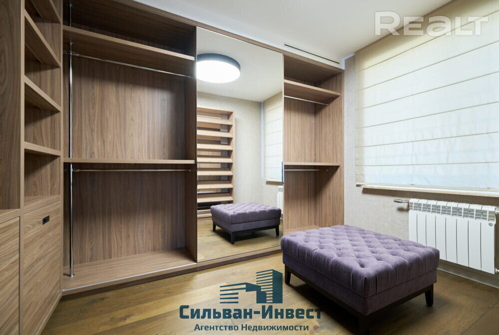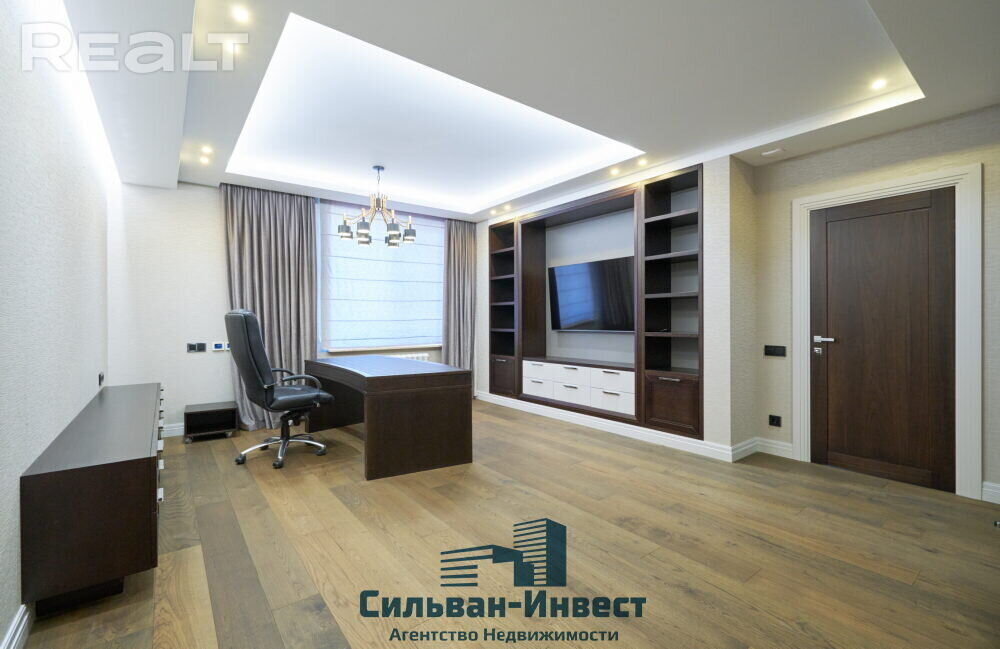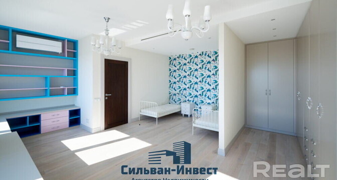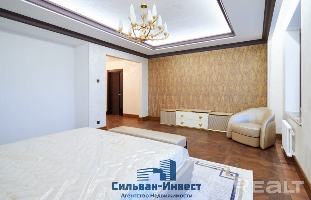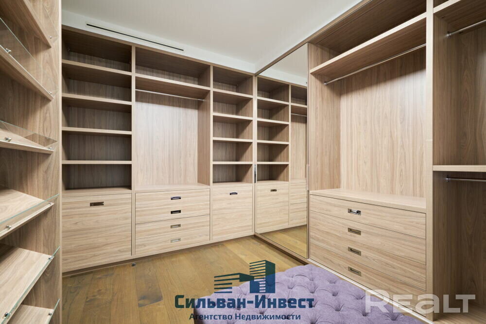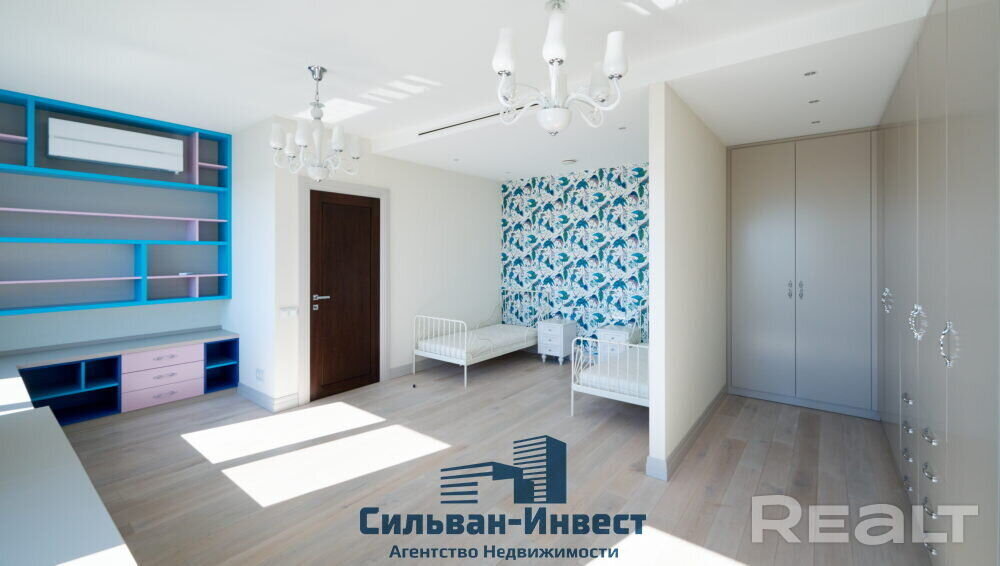 Квартира состоит из шести жилых комнат, трех санузлов с душем и ванной, гардеробной, хозяйственной комнатой, двух застекленных балконов. Тут сделан дизайнерский ремонт. На полу в комнатах лежит дубовый паркет, плитка - в гостиной и санузлах. Встроенную и мягкую мебель делали под заказ. Помимо мебели, в квартире остается и техника: кондиционеры Mitsubishi Electric, бытовая техника Smeg: холодильный, духовой шкаф, микроволновка, плита, посудомоечная машина, винный шкаф, стиральная машина и сушка.