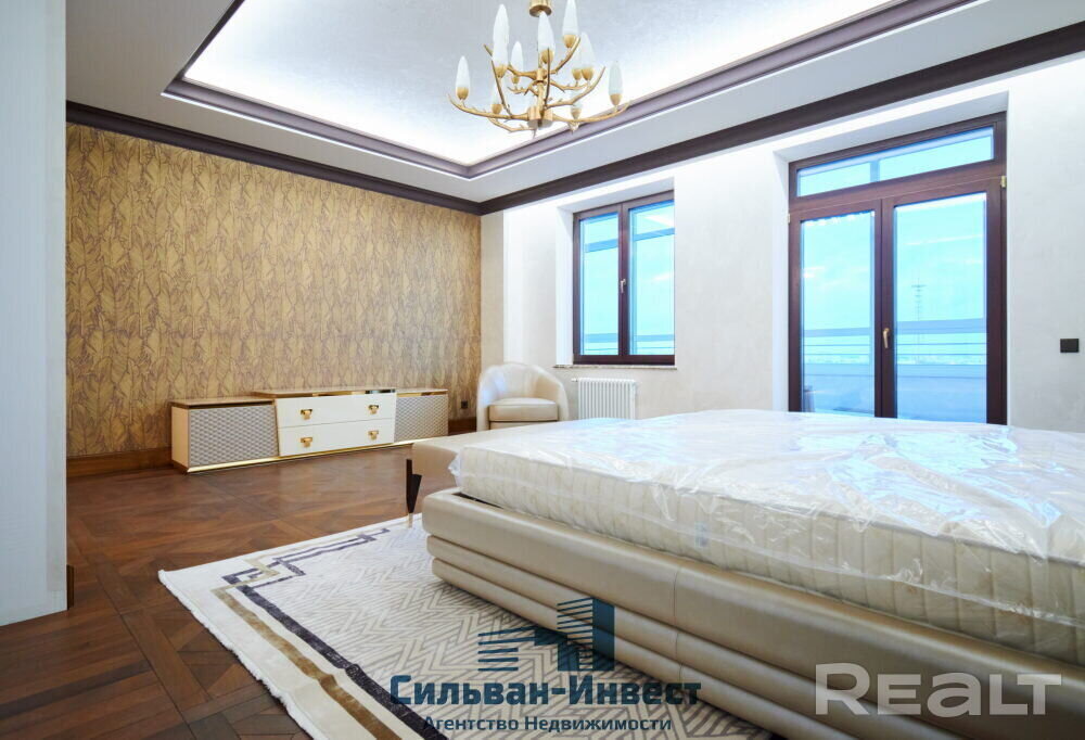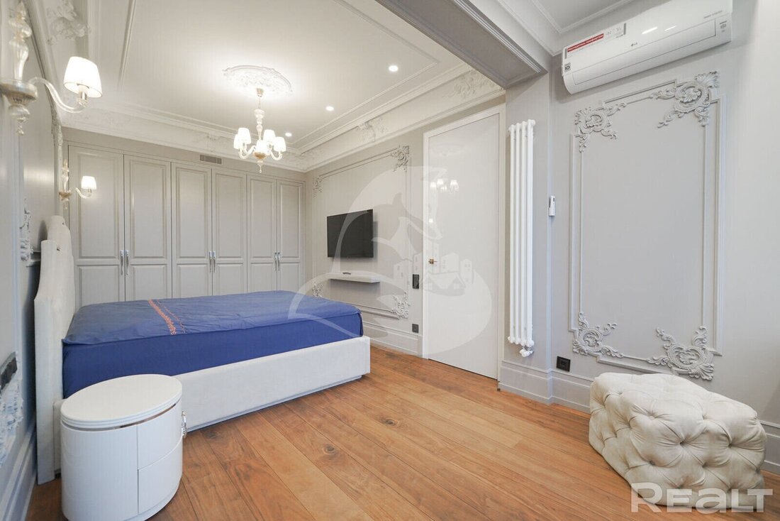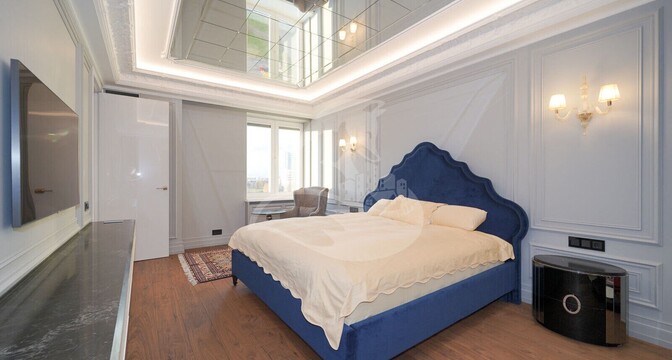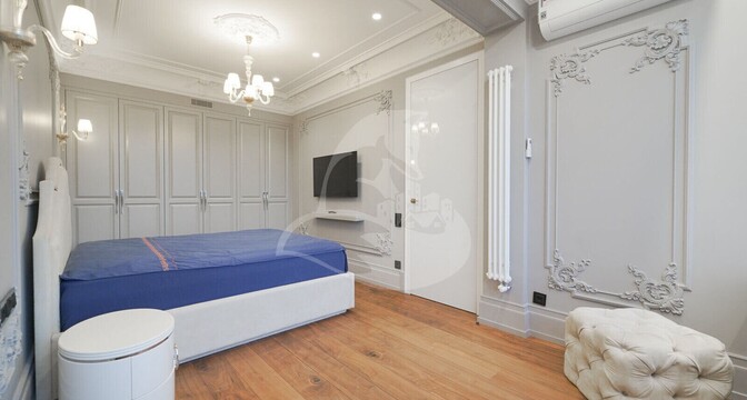 В спальне разместилась также и гардеробная. В комнате имеется вход в личный санузел. Вся сантехника от брендов Villeroy & Boch, Hansgrohe коллекции axor. Мебель с позолотой изготовлена итальянской фабрики Cappellini.