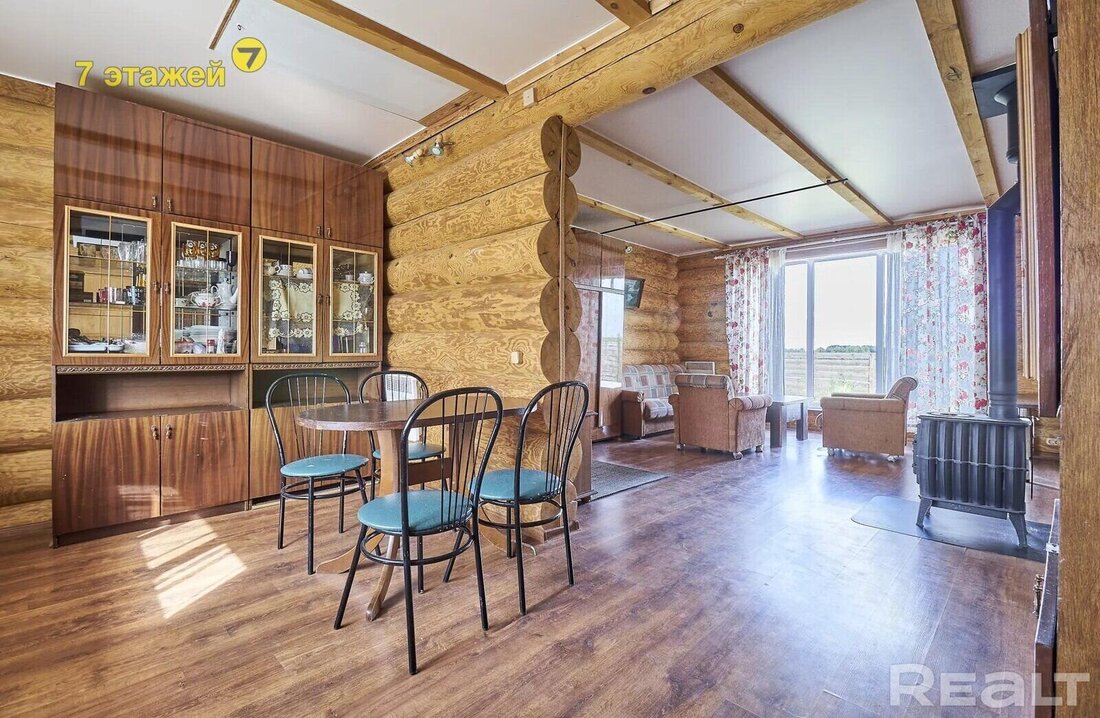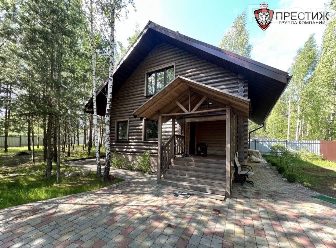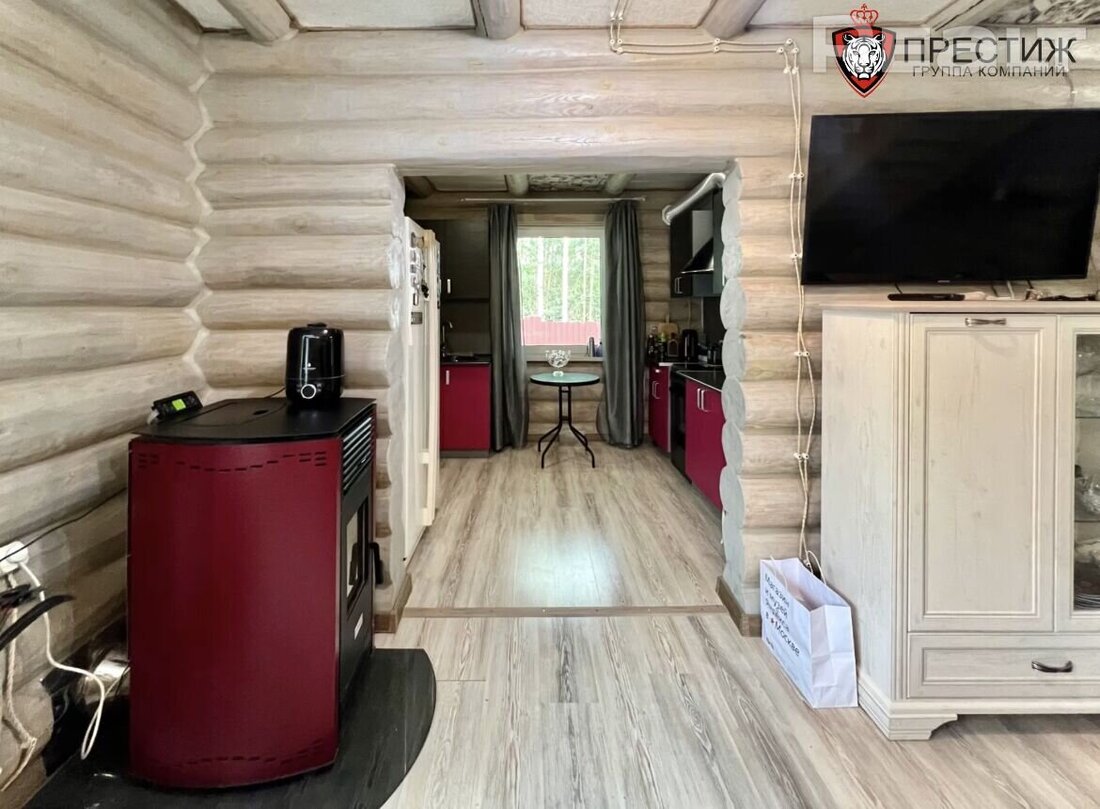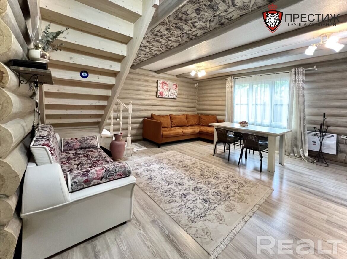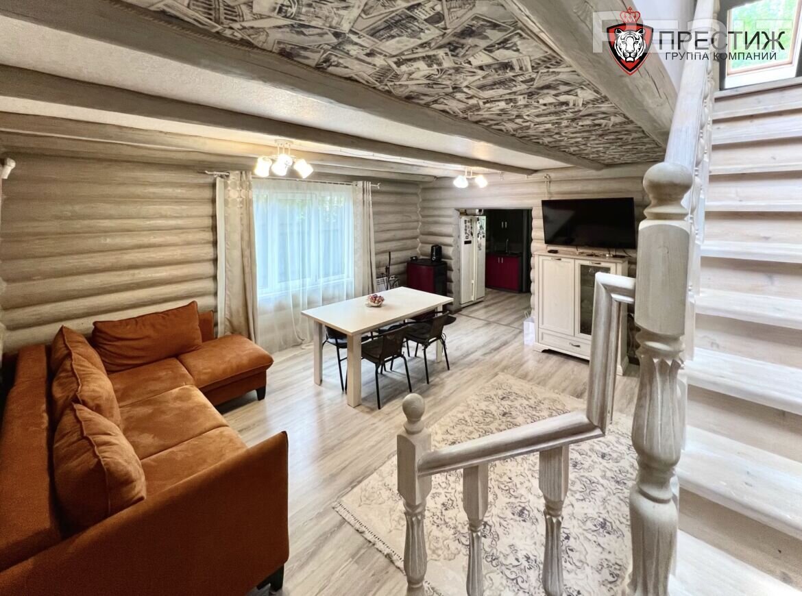 Здесь продается современный двухэтажный бревенчатый дом (оцилиндрованное бревно). Он новый, 2021 года постройки. Общая площадь — 120 м2.