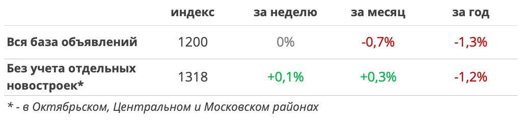 Все представленные ниже данные рассчитаны на основе всей базы объявлений (с учетом объявлений о продаже квартир в отдельных новостройках в Октябрьском, Центральном и Московском районах).