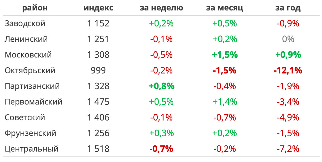 Среди районов наиболее заметный рост количества предложений наблюдался в Центральном, Октябрьском и Партизанском районах. Снижение — в Заводском и Первомайском.