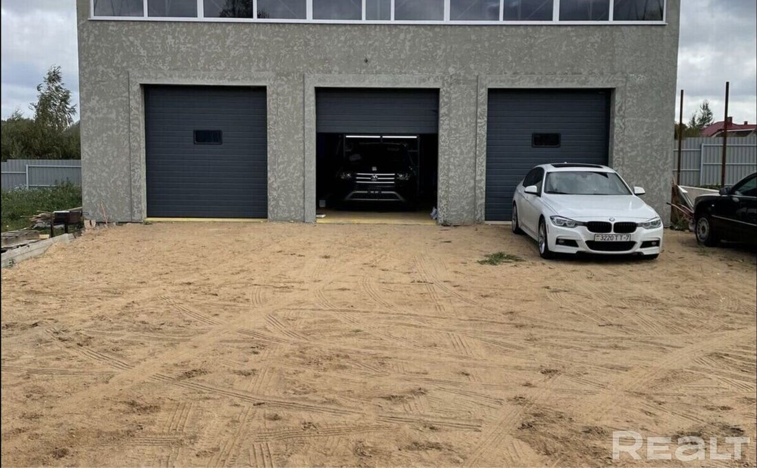 На участке имеется еще одна постройка на 106 м2 с тремя секционными воротами, внешне напоминающая гараж или СТО. К ней подведена вода и канализация.