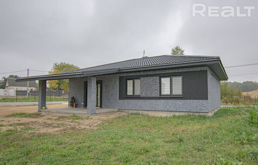 Дом новый, 2021 года постройки. Он одноэтажный, с вальмовой крышей. Стоит на надежном фундаменте, поверх стен из блоков (500 мм) отлит железобетонный армопояс. Кровля — модульная черепица BUDMAT, окна и двери — Salamander с фурнитурой Roto.