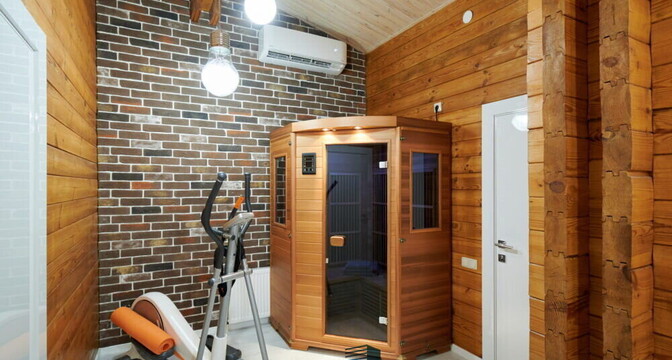 На втором этаже разместились 2 спальни, санузел и гардеробные. Также здесь есть инфракрасная сауна из сибирского кедра и уютная лаунж зона.