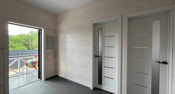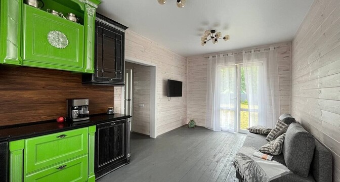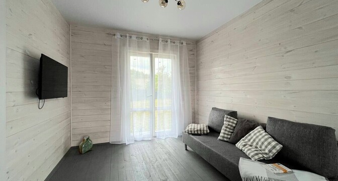 Планировка дома напоминает евротрешку: две спальни и совмещенная кухня-гостиная. Здесь есть и совмещенный санузел. Внутри дом тоже отделан деревом, в ванной комнате на стенах и на полу — плитка.