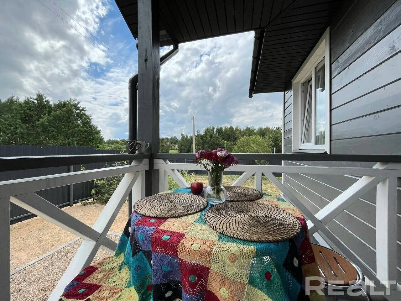 Также к дому прилегает небольшая крытая терраса, где разместился столик.