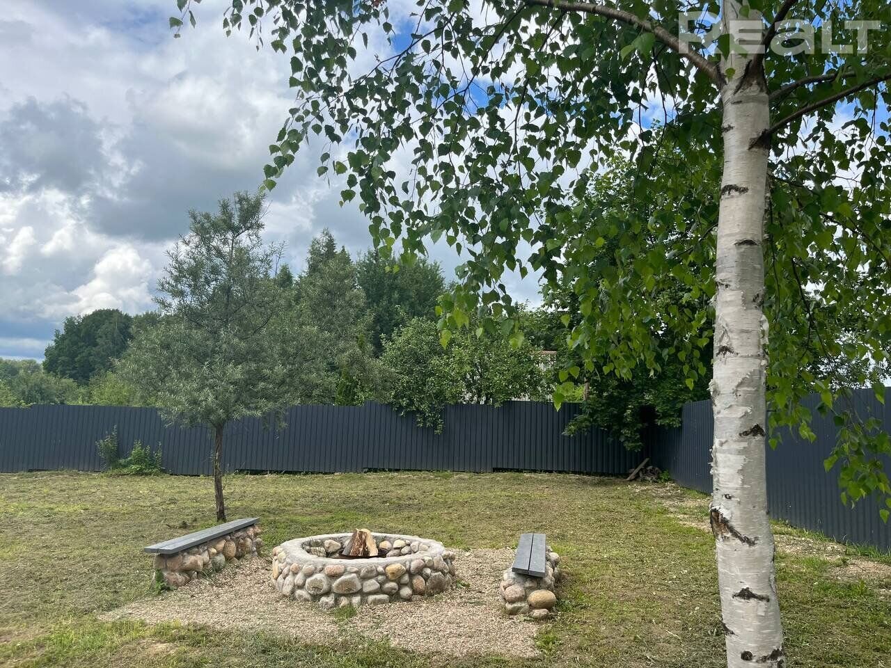 Участок занимает 10 соток. Он ровный, хоть и стоит на холме. На территории растут деревья, организована зона кострища. Участок находится под видеонаблюдением и огорожен забором.