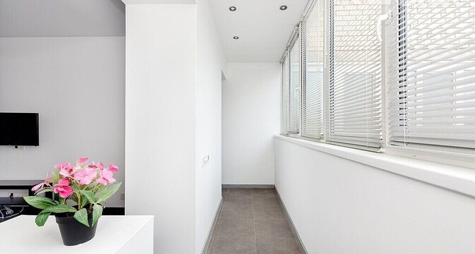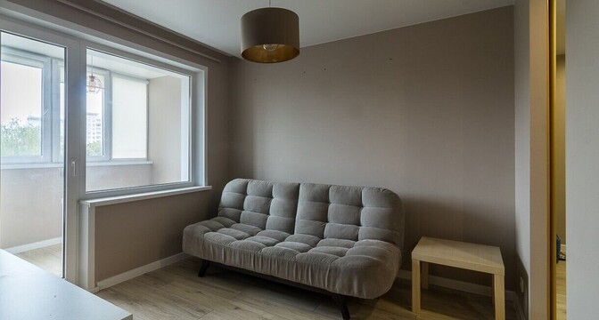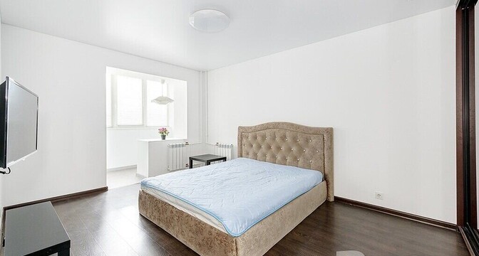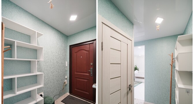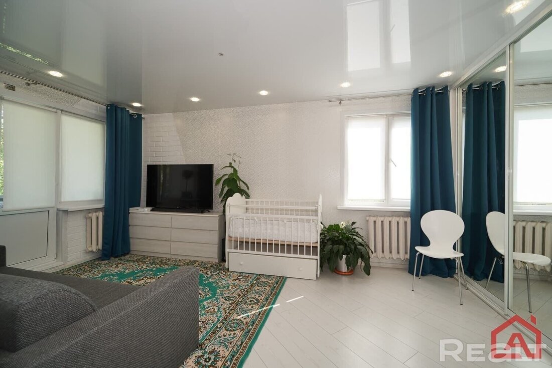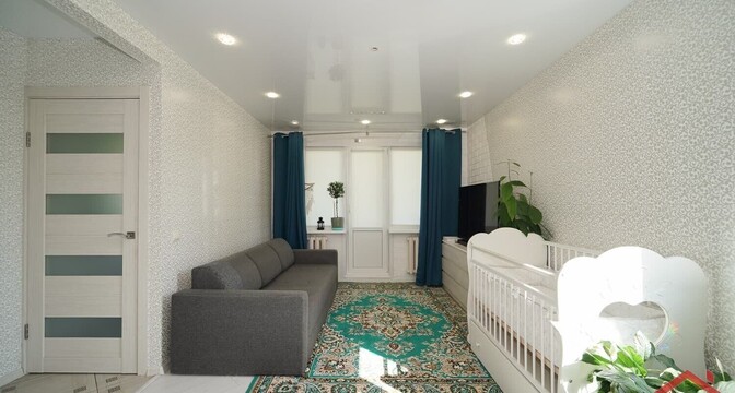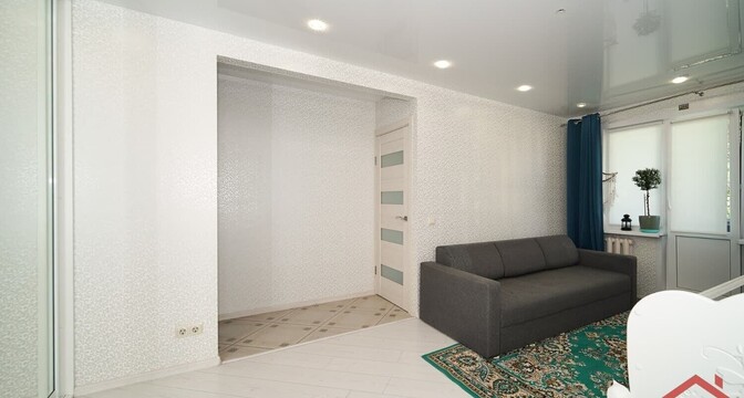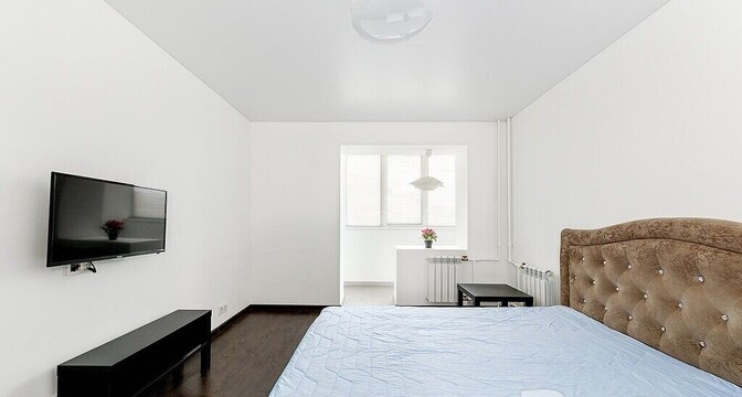 В однушке сделан свежий ремонт: на полу лежит водостойкий ламинат, стены выровнены и покрашены, полностью заменена проводка, потолок во всей квартире сделан натяжной, установлены качественные стеклопакеты, на лоджии - балконная рама.