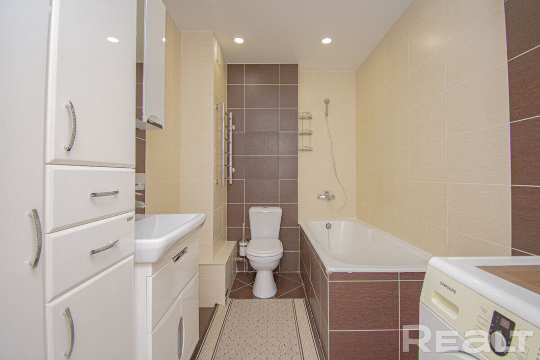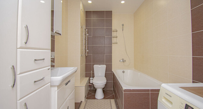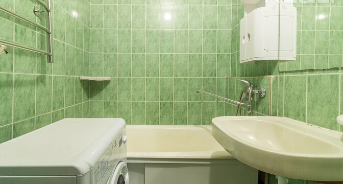 В квартире сделан хороший ремонт. К тому же в однушке остается вся мебель и бытовая техника, что позволяет заехать и жить. Здесь есть балкон и совмещенный санузел.