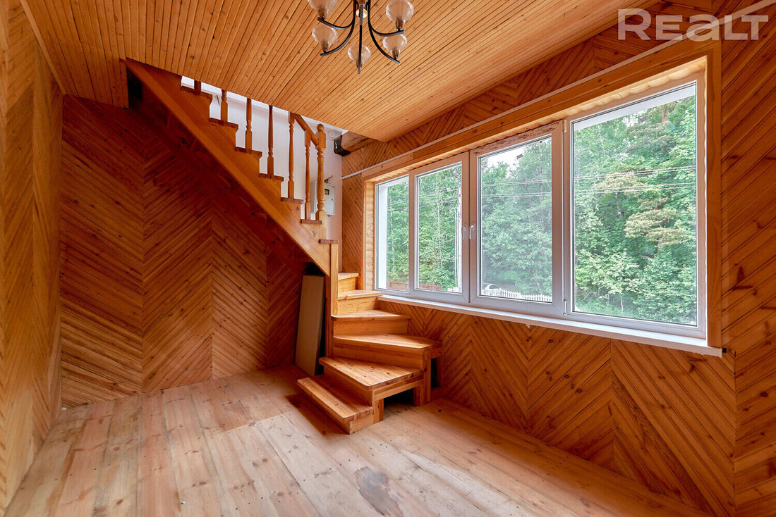 Чистовая отделка практически закончена, не во всех комнатах. Например, в санузлах нет плитки, есть не покрашенные стены. В доме деревянные полы, новые окна.