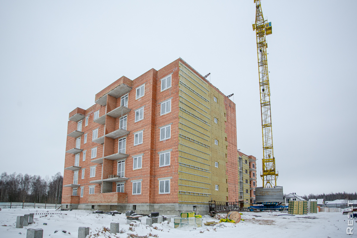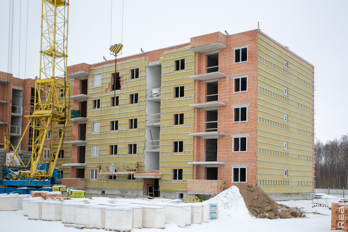 Два других дома тоже подрастают, на них активно ведутся работы: шумит кран, ездит трактор, строители укладывают кирпичи. Дома второй очереди планируют сдать в апреле этого года.