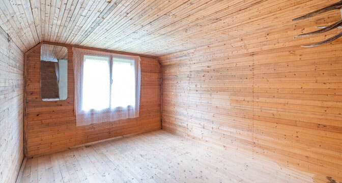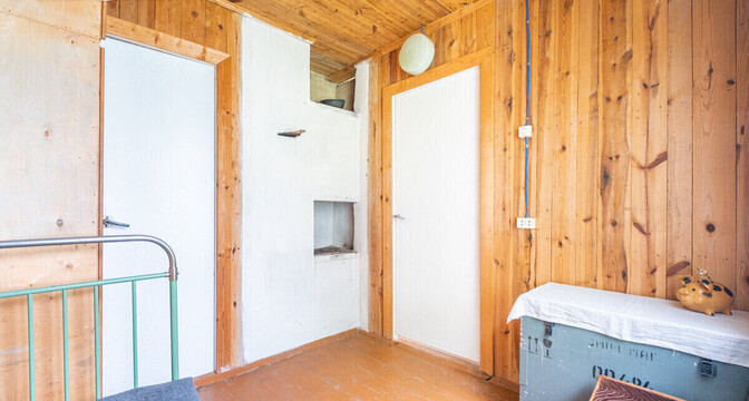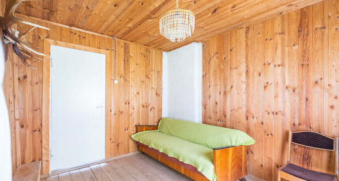 В доме одно помещение, которое покупателям предстоит обставить по своему вкусу. Нужно будет решить вопрос и с отоплением. Туалет находится на улице, вода — сезонная, есть электричество. Внутри все отделано деревом. Естественный свет попадает в дом через два окна: одно — в зоне кухни и большое окно с перемычками по центру стены.