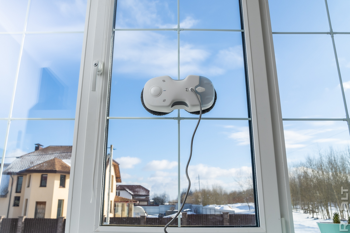 Сначала включаем HUTT DDC55 внутри. Здесь загрязнений гораздо меньше, он быстро справляется — и мы прикрепляем его к внешней стороне окна. На улице ветрено и холодновато, поэтому мы сразу же прикрываем створку обратно, чтобы в доме было по-прежнему тепло. В этом еще одно преимущество робота перед мытьем окна своими руками: вам не придется мерзнуть, отмывая внешнюю сторону окна, и не придется откладывать мытье на весну.