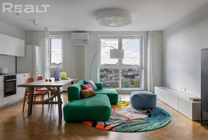 Квартира с дизайнерским ремонтом находится недалеко от метро «Молодежная». Здесь две изолированных комнаты и кухня, совмещенная с гостиной. Вся мебель в квартире акцентных цветов: зеленый диван, оранжевая кровать и розовый умывальник интересно смотрятся на фоне белоснежных стен. Показываем, как выглядит квартира, и рассказываем, сколько стоит.