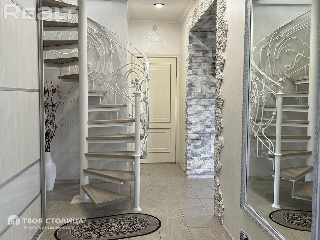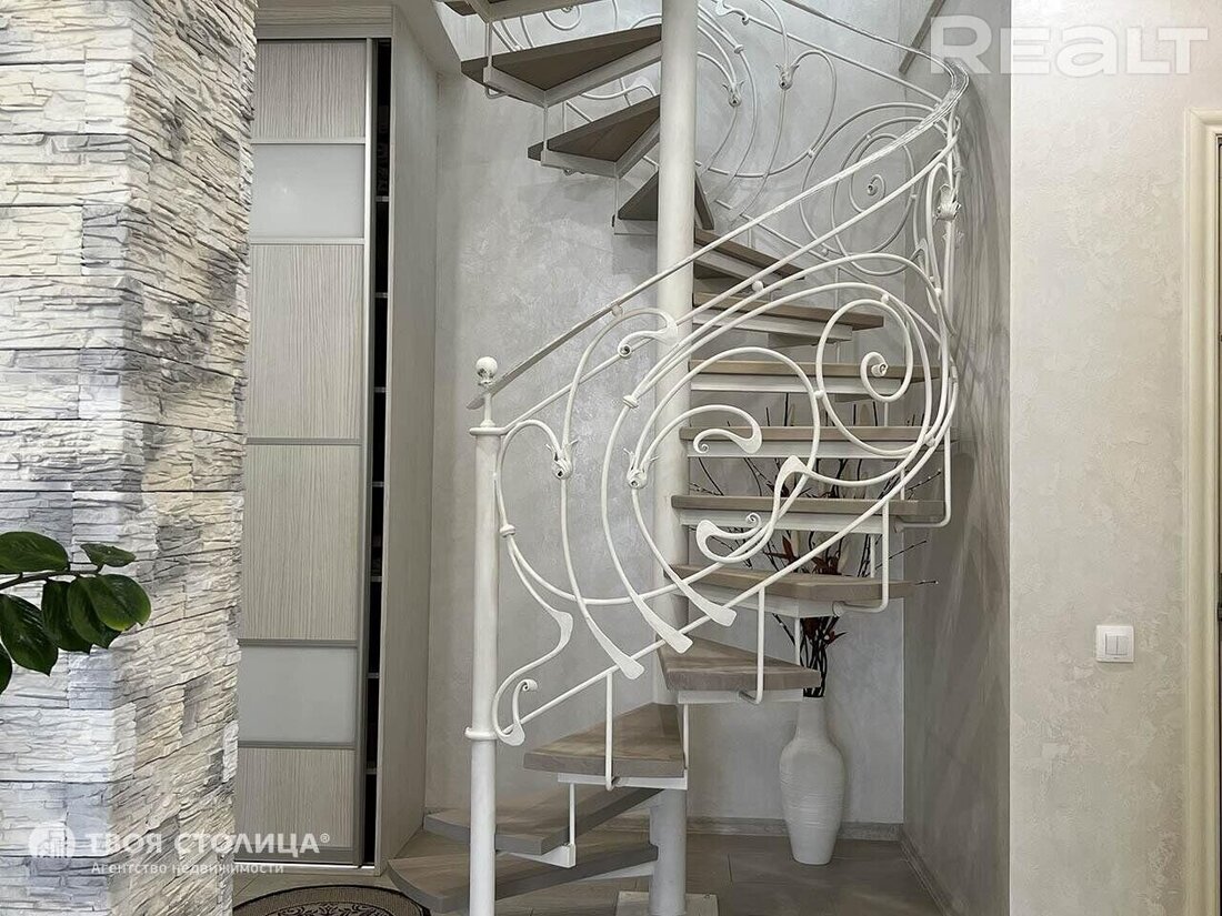На второй этаж ведет изящная винтовая лестница. Там расположена приватная часть дома — ванная комната, две спальни и кабинет. Обратите внимание на размеры мастер спальни — почти 30 «квадратов».