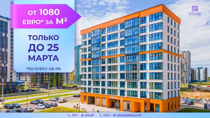 ТОЛЬКО ДО 25 МАРТА цена м2 элитной недвижимости в MinskWorldОТ 1080 ЕВРО(по курсу Национального банка Республики Беларусь). Акция непродолжительная: на этот период компания заморозила цены, чтобы клиенты смогли выбрать свои апартаменты.