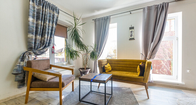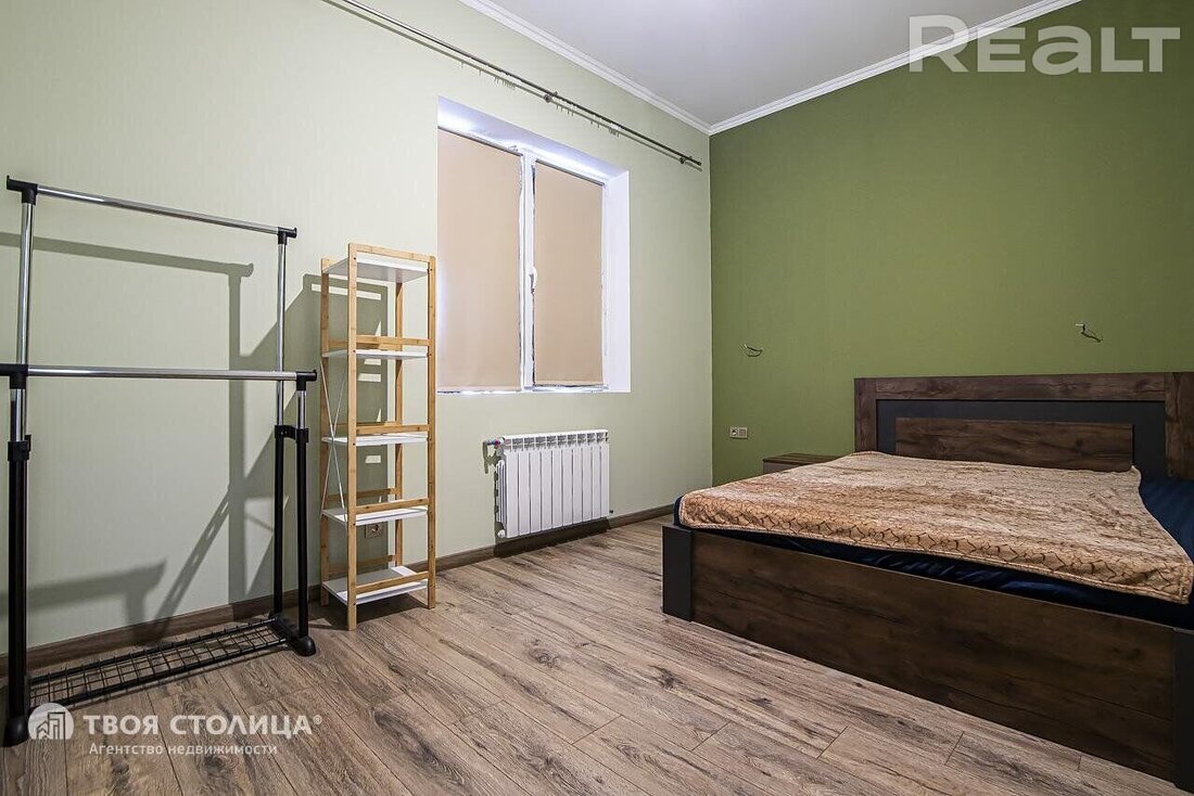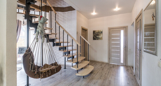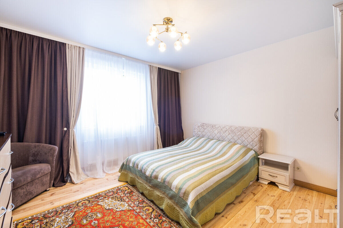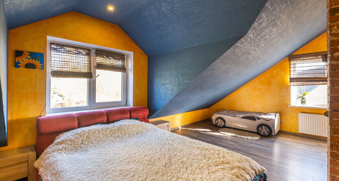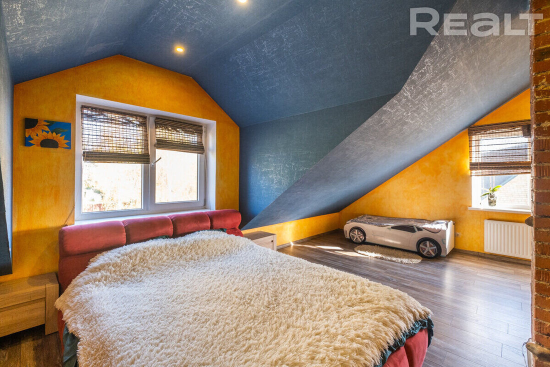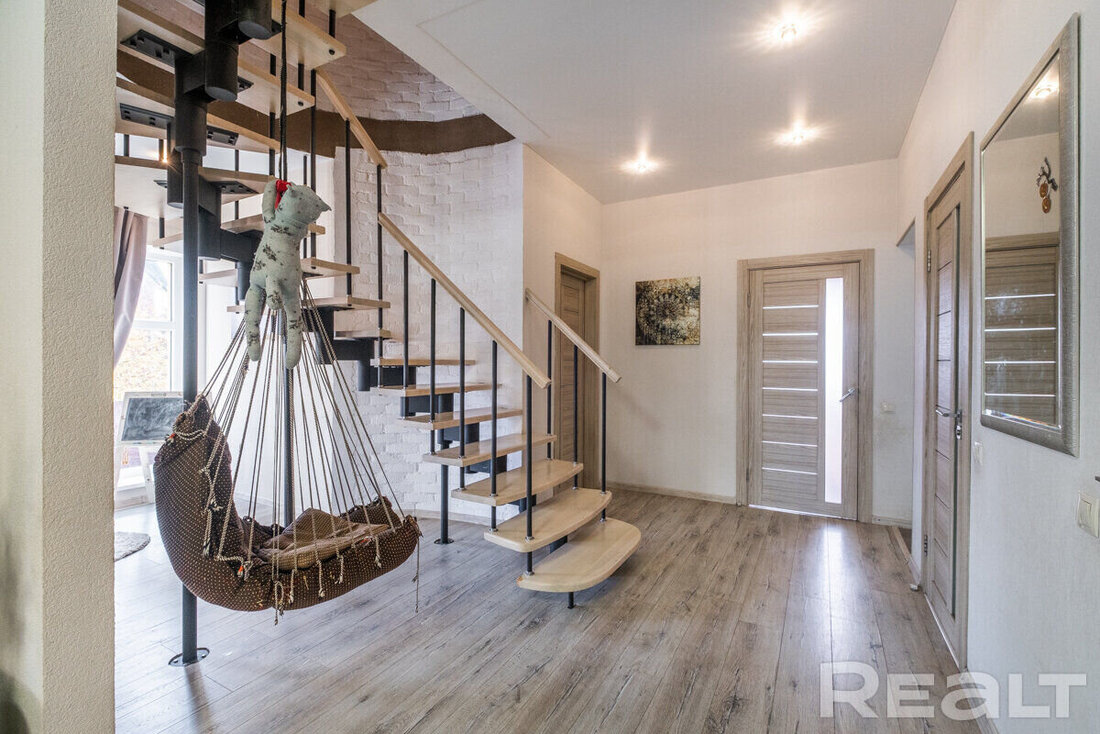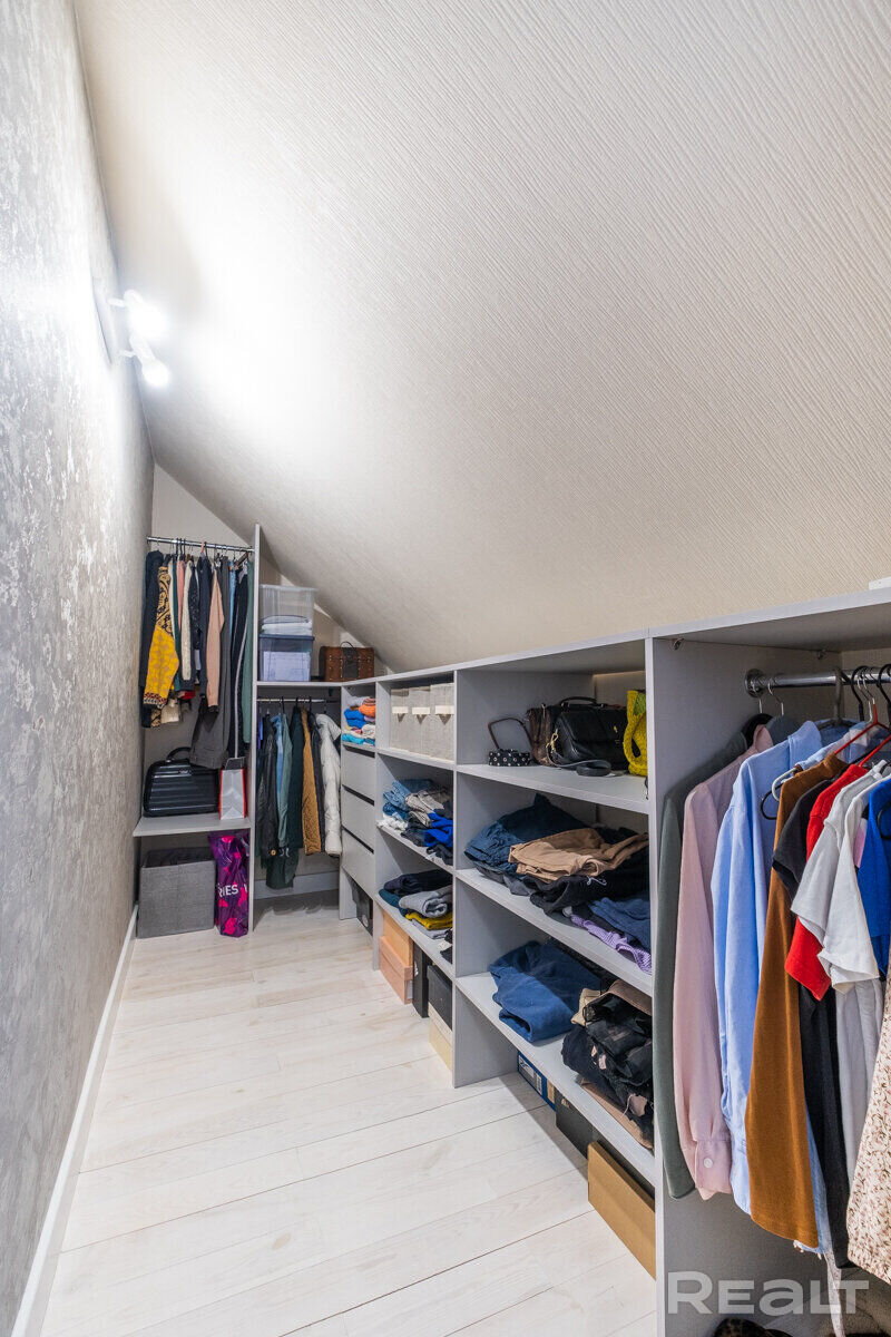 На первом этаже — гостиная, совмещенная с кухней, две спальни, санузел и котельная с газовым одноконтурным котлом и накопительным бойлером на 150 литров. На втором этаже четыре спальни и санузел. В одной из спален есть гардеробная и выход на балкон. Сделан дизайнерский ремонт.