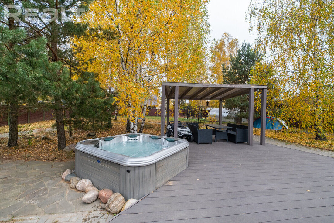 Участок — 15 соток. Во дворе есть беседка с мебелью и джакузи.