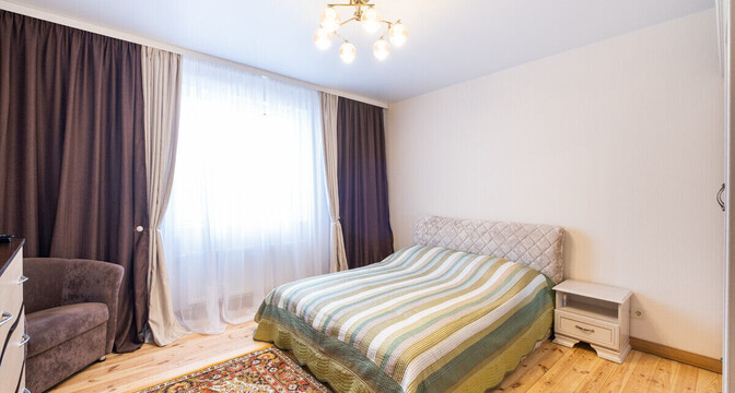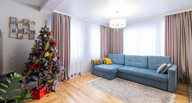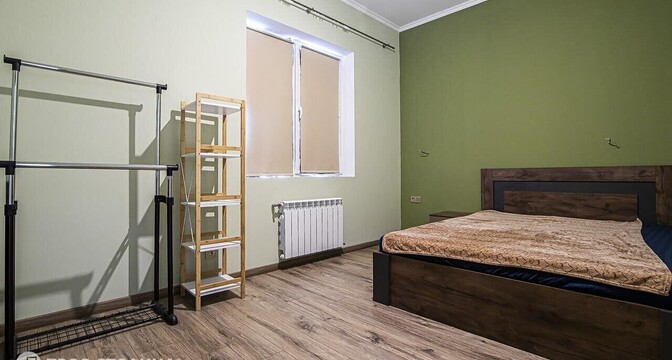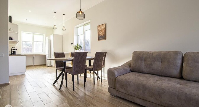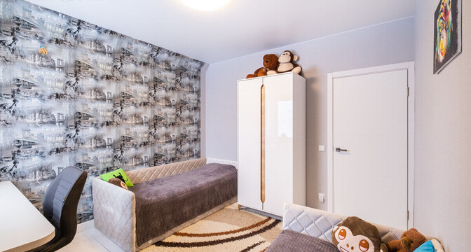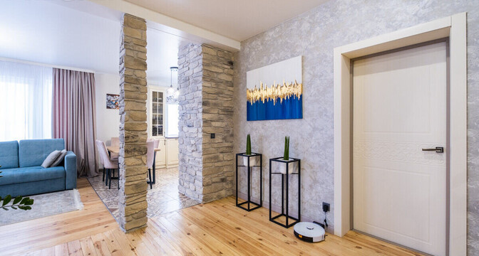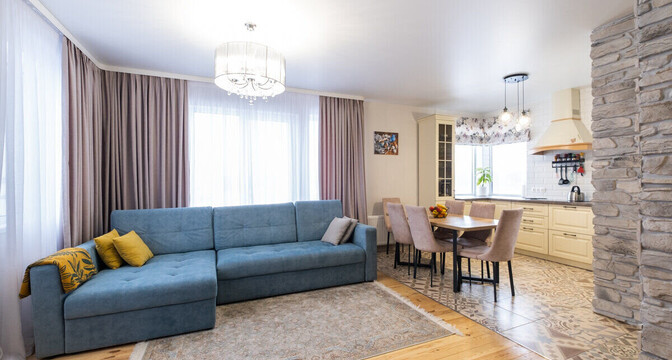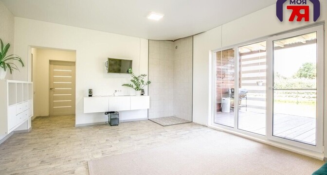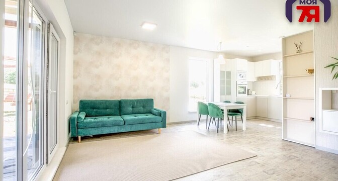 Здесь две жилые комнаты, кухня-гостиная, санузел, прихожая и терраса. Установлен «Умный дом».