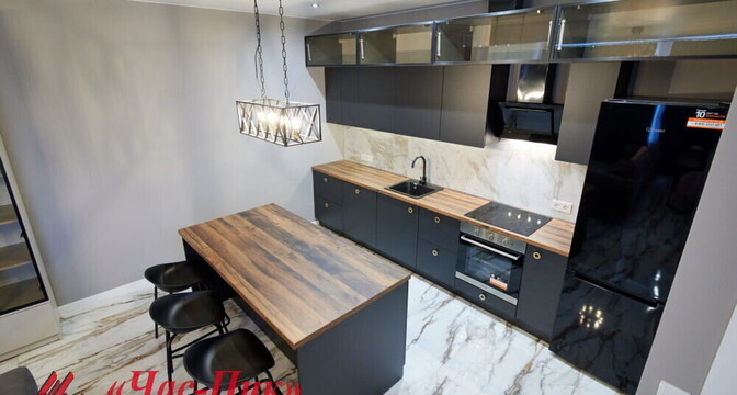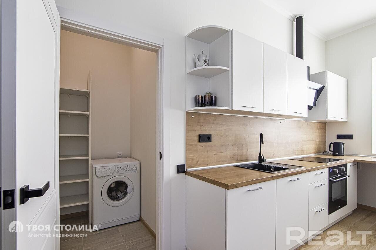 Вся бытовая техника европейского производства — индукционная плита, посудомоечная машина, печь СВЧ, духовой шкаф, холодильник, вытяжка.