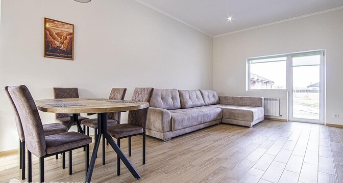 Площадь дома — больше 130 «квадратов». Кухня совмещена с гостиной, три жилые комнаты, раздельный санузел, терраса. Отдельно топочная и кладовка. Есть гараж.