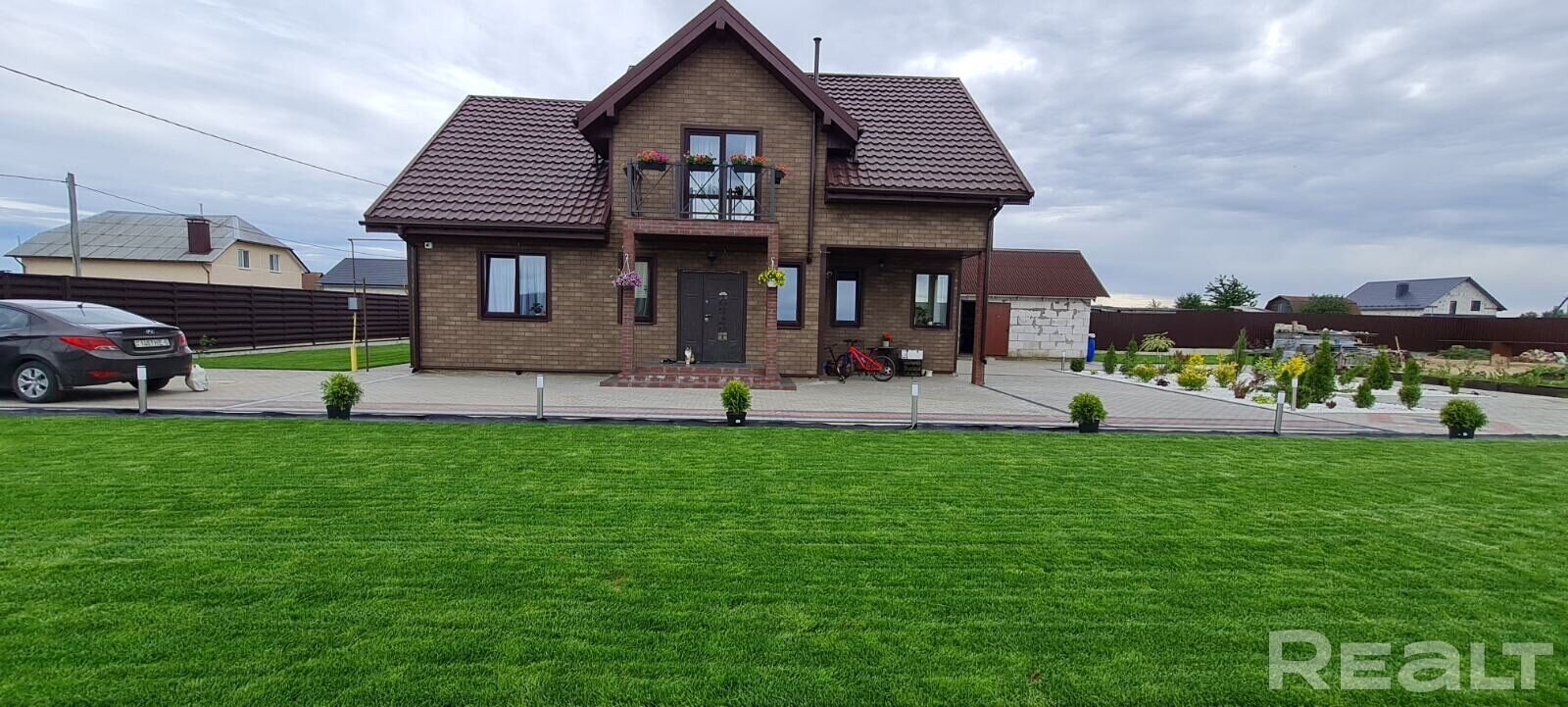 На участке лежит тротуарная плитка, ландшафтный дизайн. Декоративное освещение фасада и земельного участка.