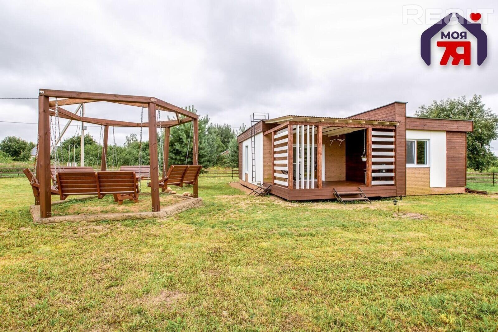 Участок — 10 соток. Высажен газон. Есть место для строительства бани. Установлены дизайнерские качели.