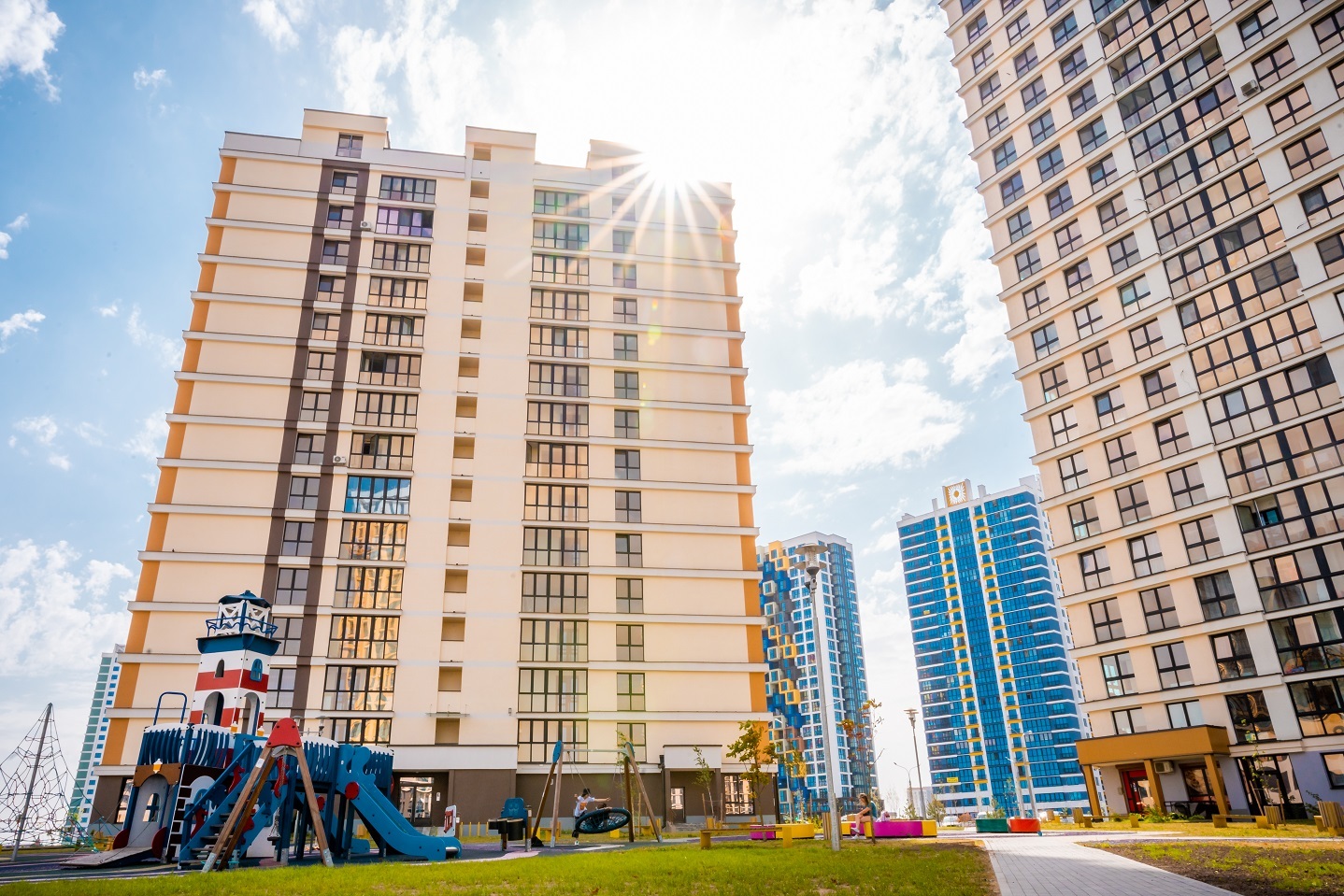 В многофункциональном комплексе созданы безопасные прилегающие территории с яркими и красочными детскими площадками, на которых уже этим летом могут резвиться ваши малыши, теннисными кортами, баскетбольными стадионами, скамейками для отдыха, лежаками для солнечных ванн, территориями воркаута для поддержания хорошей формы.