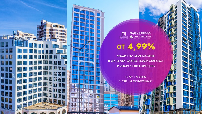 На готовые и строящиеся апартаменты в многофункциональном комплексе Minsk World можно взять кредит на срок до 20 лет. В первый год ставка всего 4,99% годовых. При кредитовании до половины стоимости объекта кредит предоставляется без поручителей. В жилых комплексах «Маяк Минска» и «Парк Челюскинцев» увеличен льготный период кредитования — 2 года под 5,49%. И кредит также можно оформить на срок до 20 лет. Динамика снижения ставки рефинансирования положительно сказывается на рынке недвижимости.