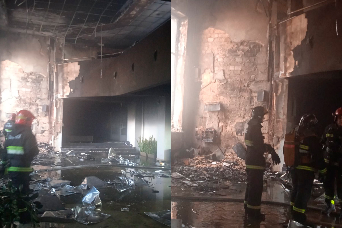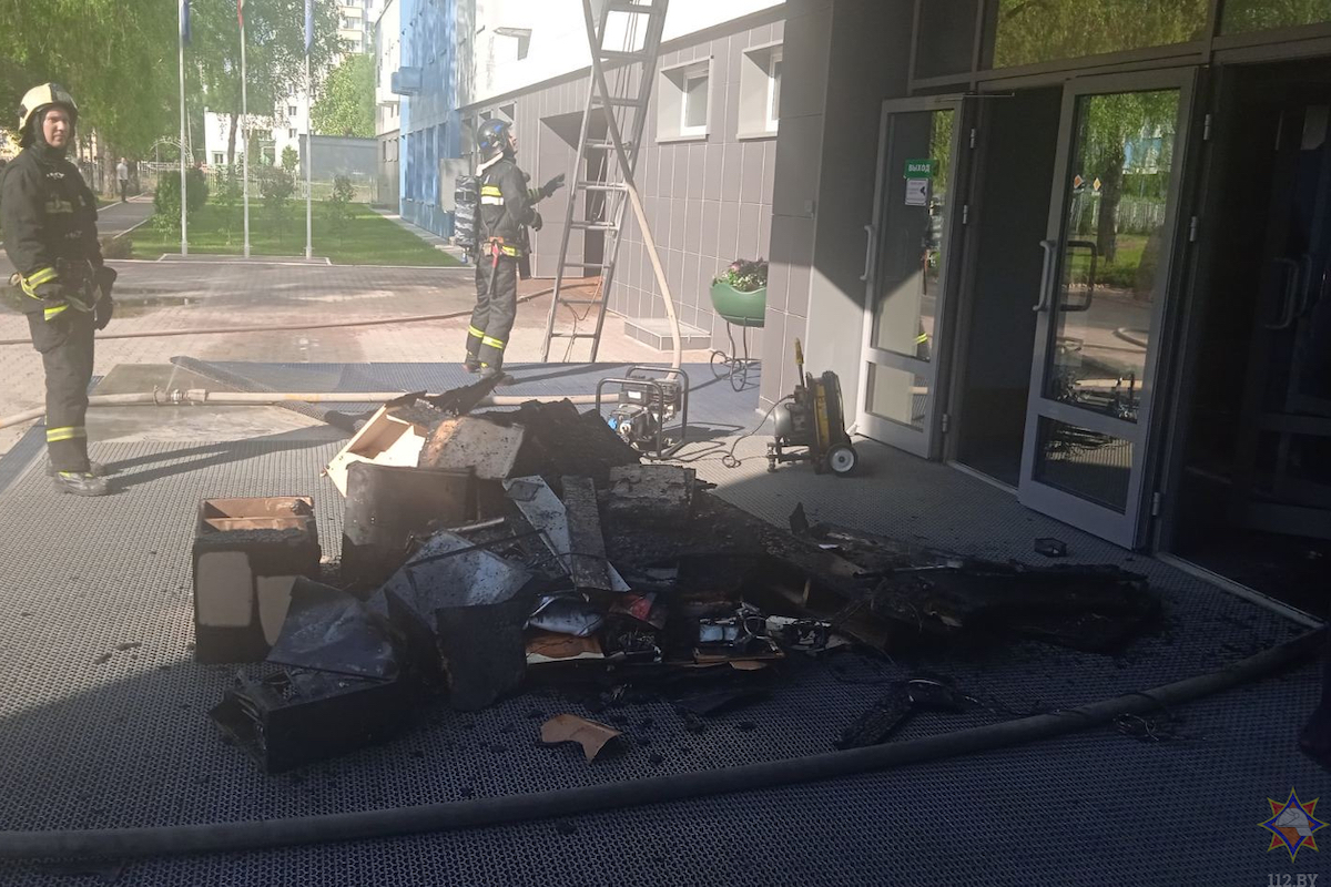 Когда на вызов приехали пожарные, из окна был виден черный дым. Оказалось, что в здании вестибюля на 30 квадратных метрах случился пожар — повреждены вещи, подвесной потолок, мебель, остекление, закопчено помещение.