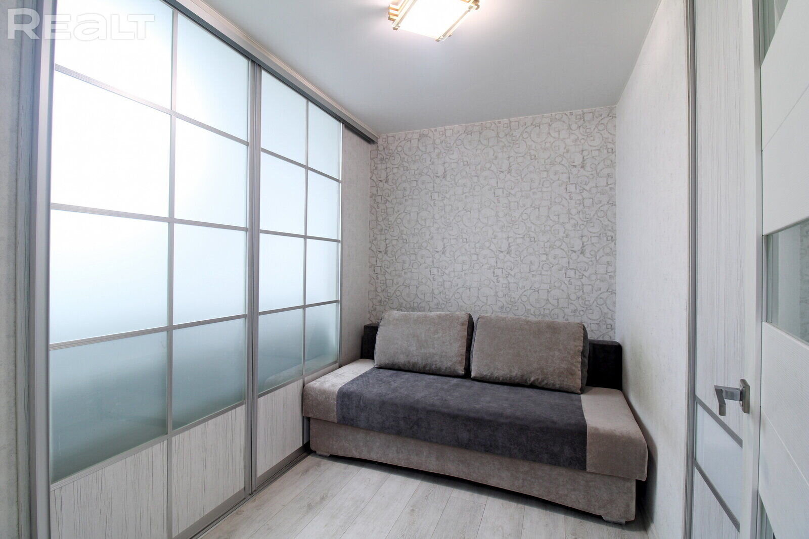 В квартире сделана небольшая перепланировка: комната зонирована перегородками на гостиную и спальню (перепланировка узаконена, технический паспорт соответствует фактическому состоянию квартиры).