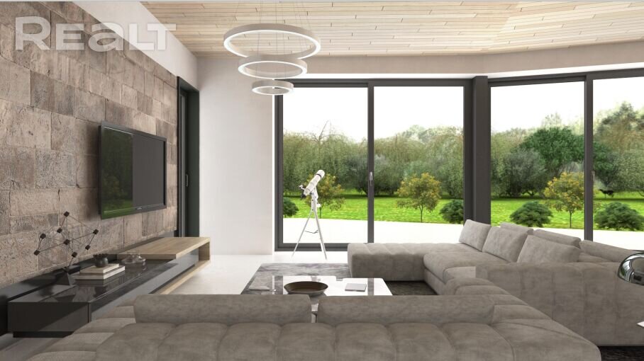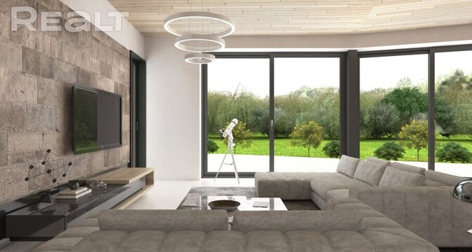 Интересное решение для огромной гостиной — ее потолок держит 12-ти метровая клееная балка сечением 600×460 мм. Опираясь на трубный профиль, позволяет облегчить и расширить пространство гостиной, из которой открывается шикарный вид через панорамное остекление высотой 3 метра. Кстати, высота гостиной 3,8 метра.