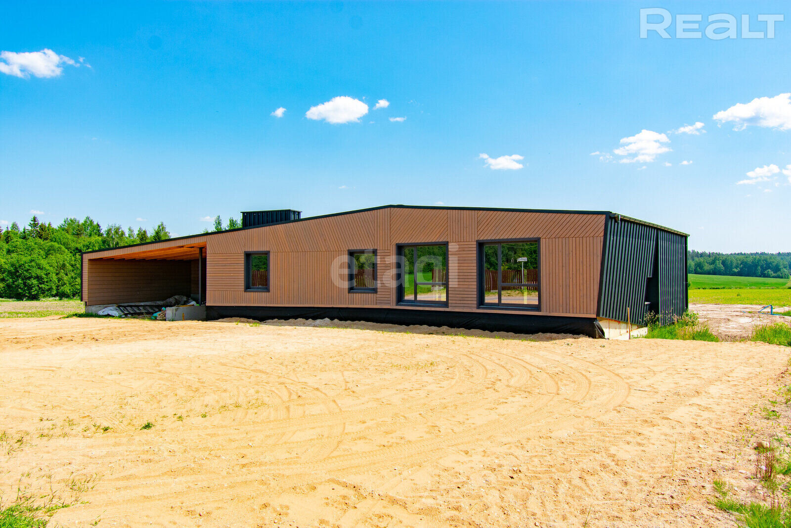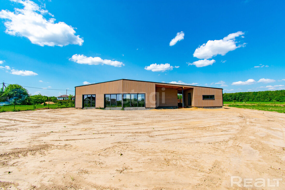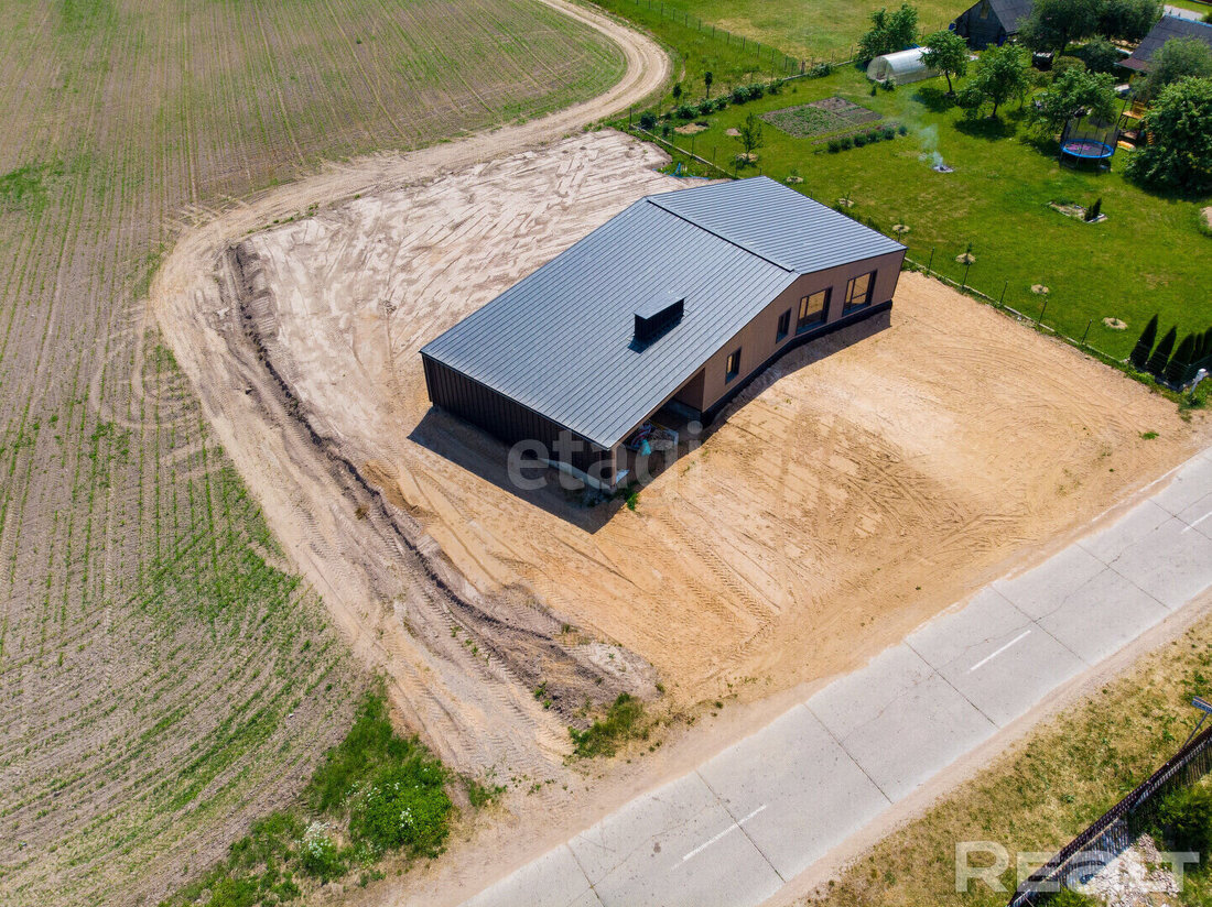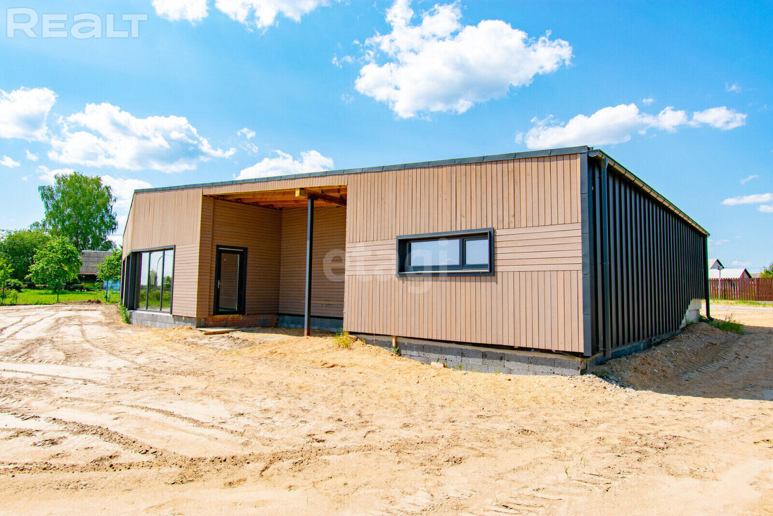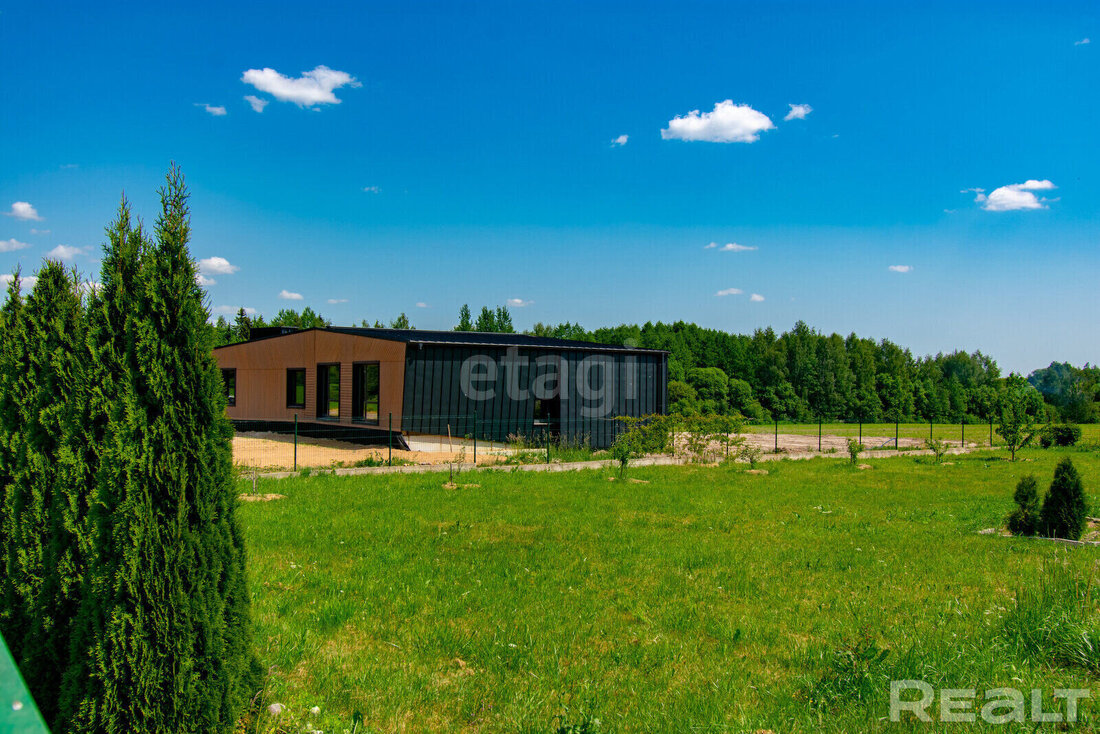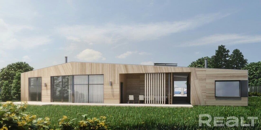 Окна в доме энергоэффективные — теплые стеклопакеты установлены в профиль из клееной древесины и окрашены в цвет кровли.
